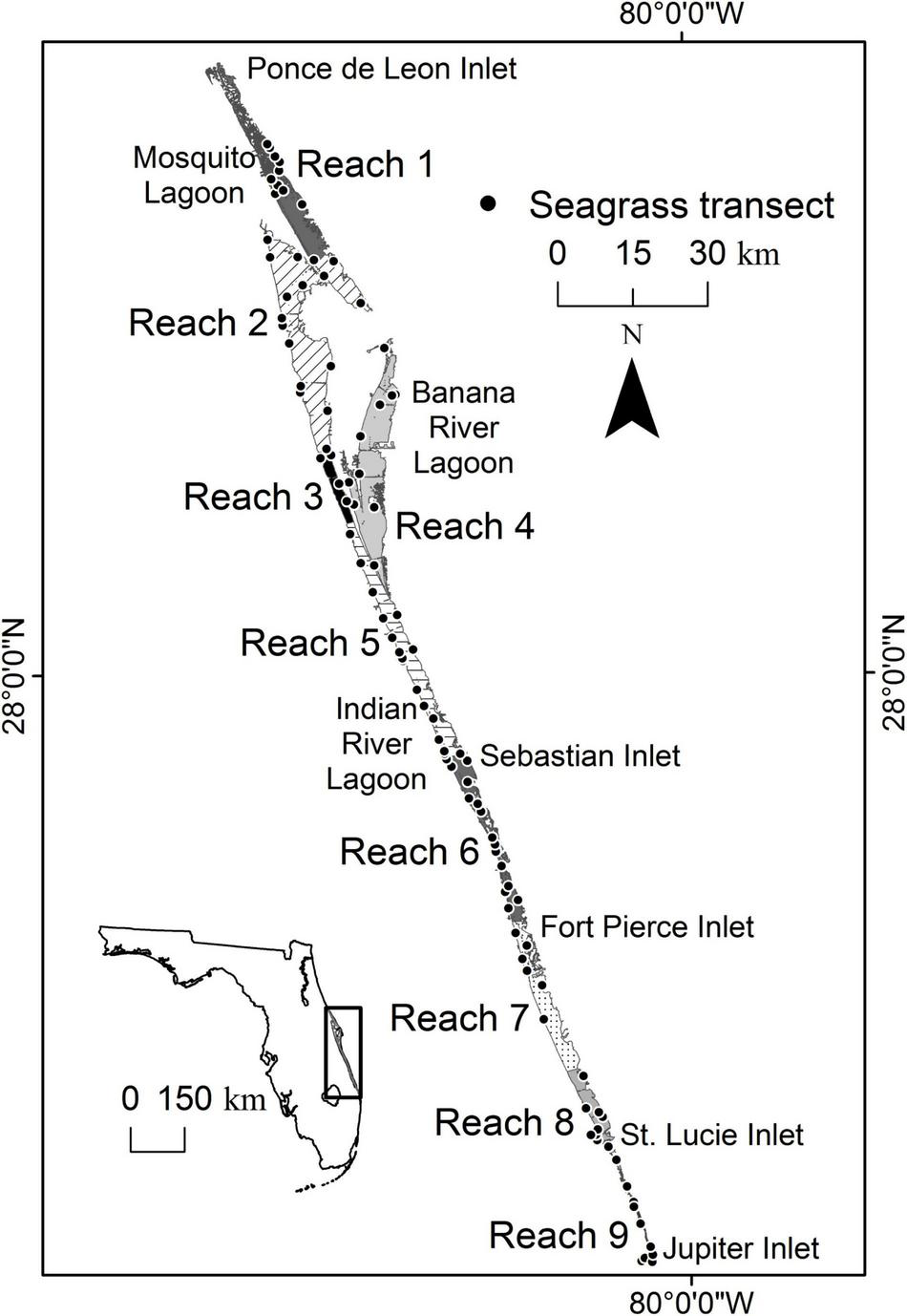 In this paper, we examine how the distribution and abundance of seagrasses in the Indian River Lagoon (IRL) responded to spatiotemporal patterns in salinity, temperature, and the availability of light. Seagrasses represent a key structural habitat in the IRL that has been stressed more severely since 2011, primarily due to shading by intense and extensive blooms of phytoplankton (Morris et al., 2021; Phlips et al., 2021). The goals are to understand conditions that led to losses of seagrasses and to identify where they persisted. The resulting understanding is translated into effects on nutrient cycling, recommendations for management, and questions for further investigation.