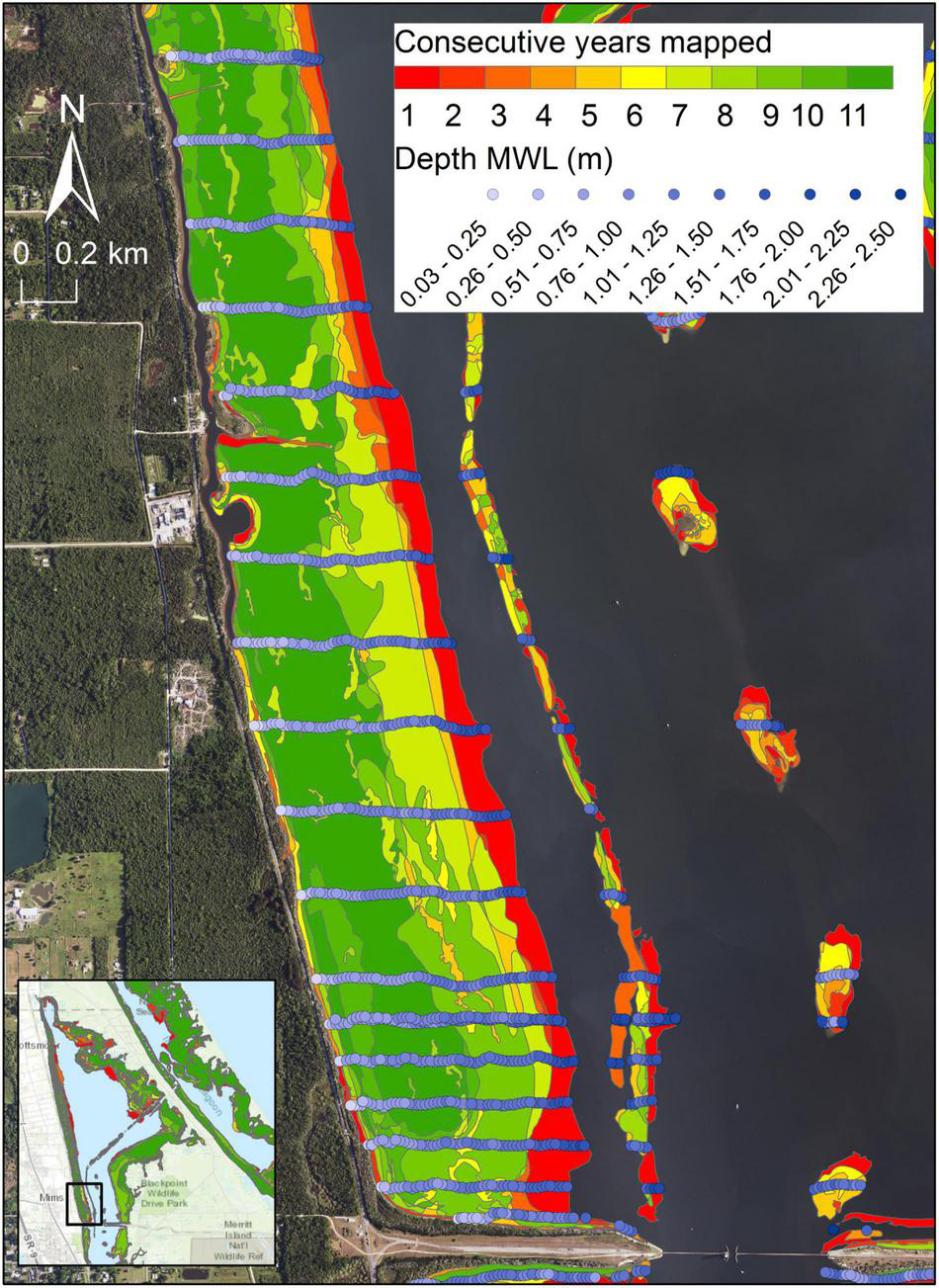 Light is mandatory for growth and survival of seagrasses, and light availability is affected strongly by depth. Depths in the IRL are influenced by seasonal changes and by tides when in proximity to the inlets. For this study, depths measured in the field are adjusted to depths below mean water level (MWL) using depth soundings taken throughout the IRL at 15.2-m intervals along east-west tracks that were spaced approximately 150–300 m apart (Coastal Planning and Engineering, 1997). The resulting bathymetry is based on over 230,000 depths that are referenced to North American Vertical Datum of 1988 and adjusted to depth below MWL.