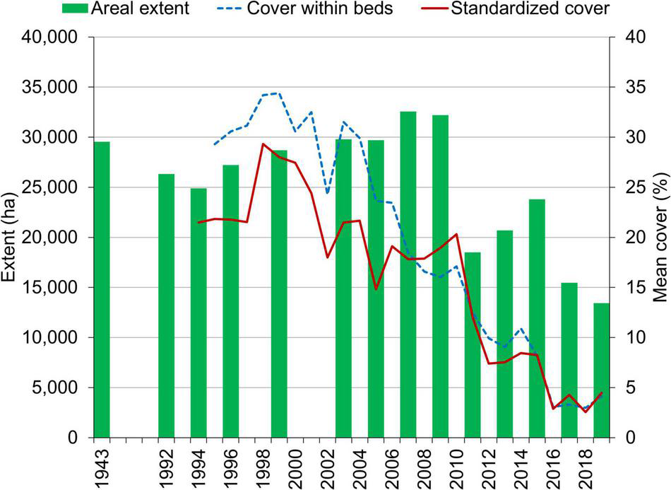 Percent cover values from summer surveys of transects in reaches 1–6 are evaluated in two ways. The mean percent cover recorded in quadrats placed within the beds is calculated for the whole system as a measure of the quality of seagrass within the beds. The same data are adjusted to account for changes in distances to the EOCs so that they accurately reflect the amount of seagrass in the system, i.e., a small area with dense seagrass is equivalent to a larger area with sparse seagrass. The adjustment for each transect involves adding values of zero beyond the recorded EOC out to the maximum distance recorded from 1996 to 2019. The resulting data are range standardized and used in a PERMANOVA based on Bray-Curtis resemblance measures. The model treats years and reaches as fixed factors, depth zones as a random factor nested in combinations of years and reaches, and transects as repeated measures nested within combinations of years and reaches.