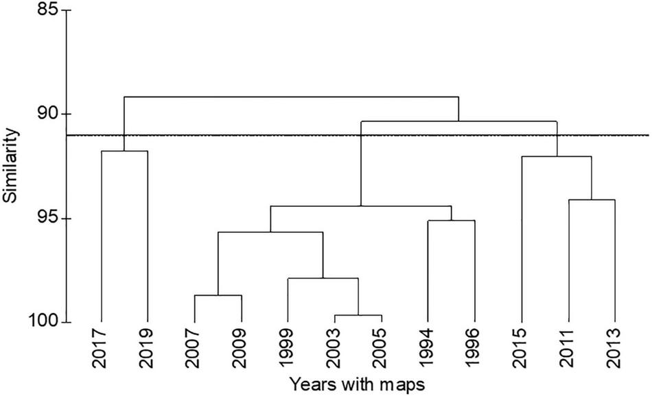 Figure 4. Hierarchical cluster analysis of areal extent of seagrass for years 1994–2019. Horizontal line marks a similarity of 91%.