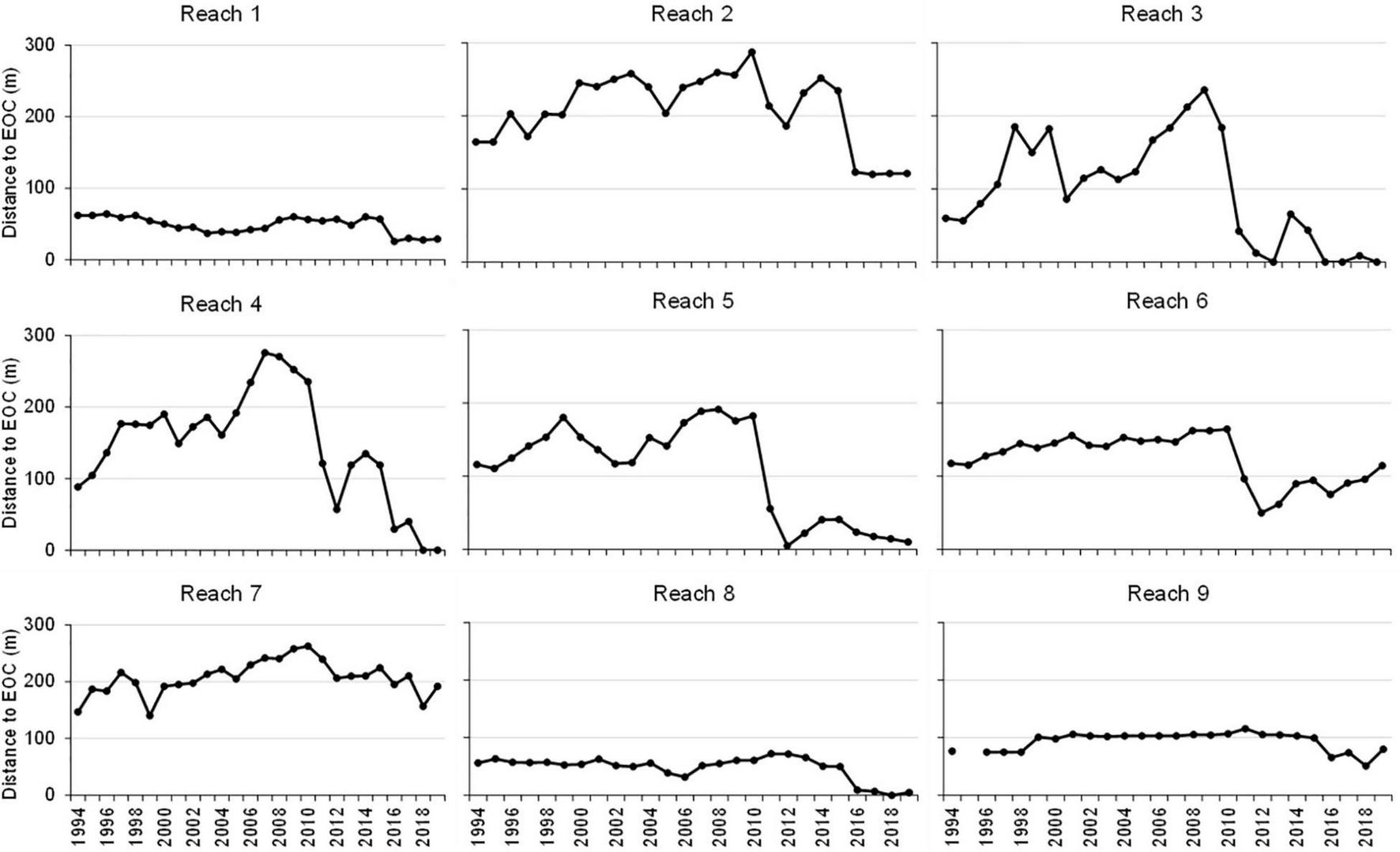 Overall, distance to the EOC and depth at the EOC paralleled changes in areal extent. As an example, the consistent mean distances to the EOC suggested there was little change in areal extent in years between maps and relatively large decreases in areal extent in reaches 1–6 and 8 during 2010–2011 and 2016–2017 (Figure 5).