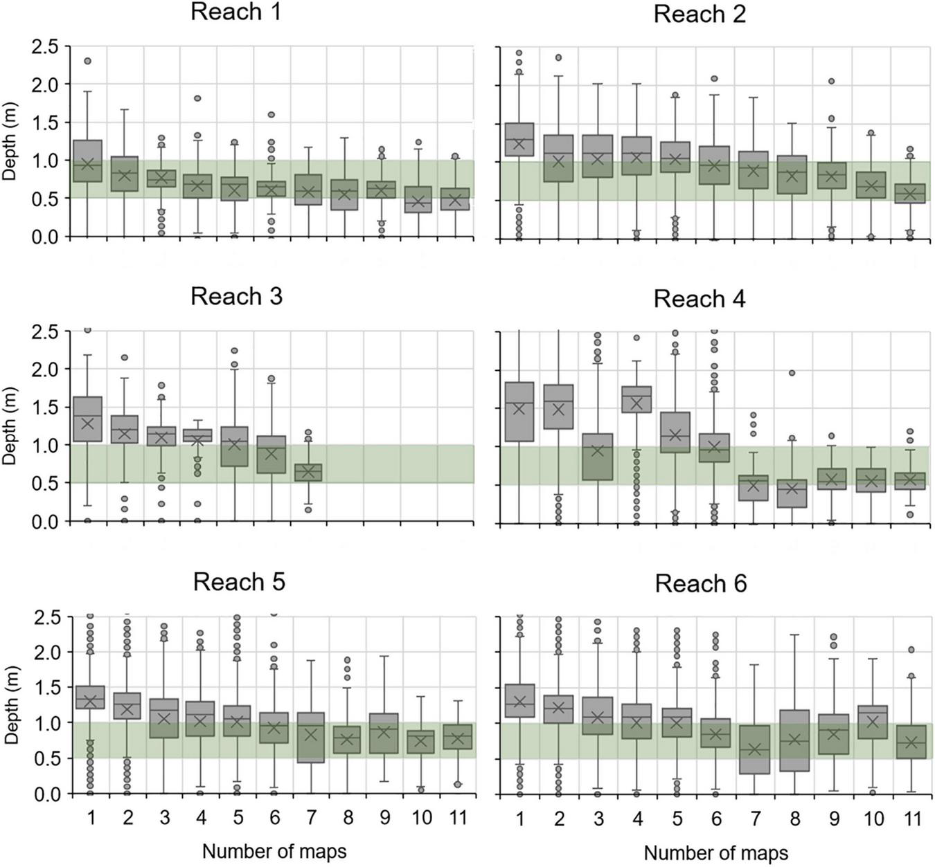Figure 6. Box plots for depths within polygons of seagrass that persisted across differing numbers of maps. Green bar, 0.5–1.0 m depths below mean water level (MWL); X, mean depth; horizontal line, median depth; box, interquartile range; whiskers, 5th and 95th percentiles; points, values beyond the 5th and 95th percentiles.