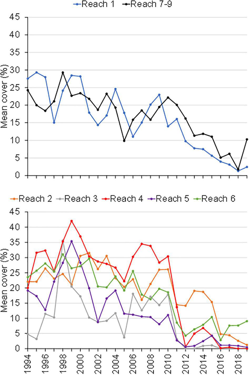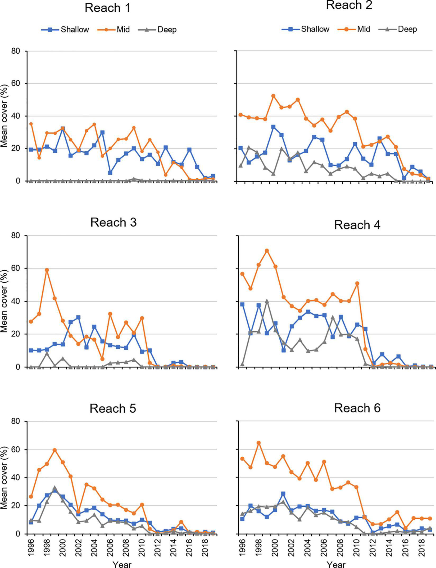 Further evidence for significant variation in cover among the three depth zones came from a PERMANOVA that indicated mean percent cover during the summer varied significantly among depths in the combinations of year (1996–2019) and reach (reaches 1–6; Table 3). Prior to 2011, the mean percent cover at the mid depths (0.5–0.9 m) tended to be higher (Figure 10). During the period of record, all reaches exhibited declines in mean percent cover, with mean cover in reaches 3, 4, 5, and 6 declining in 2011 and mean cover in reaches 1 and 2 declining in 2016–2018 (Figure 10).