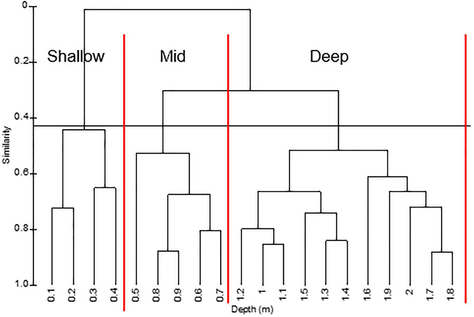 Given the variation in persistence across depths, a hierarchical cluster analysis was performed on mean percent covers in different depth zones below MWL. The analysis yielded three groups: shallow (0.1–0.4 m), mid (0.5–0.9 m), and deep (1.0–2.0+ m) at 43% similarity (Figure 9).
