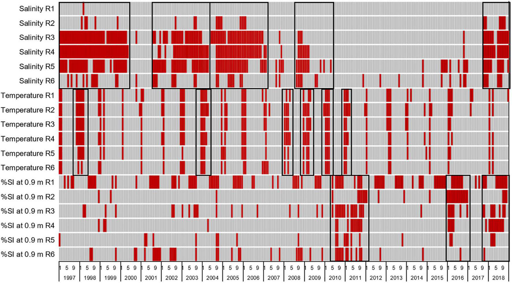 Figure 11. Heatmap with red bars indicating times when seagrass was stressed by salinities below 23 psu, water temperatures below 20°C, or less than 27% of subsurface irradiance (%SI) reaching 0.9 m for reaches 1–6. Black boxes highlight periods of widespread increased stress.