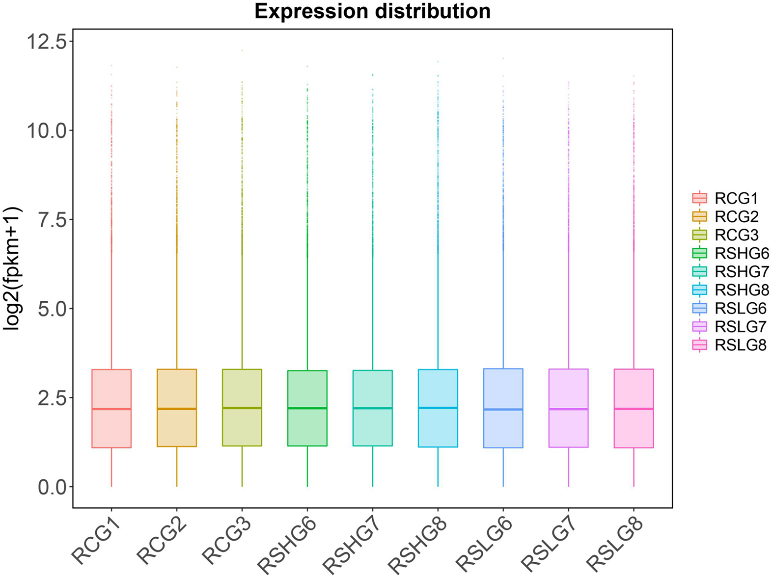 The value of FPKM was taken as the gene expression amount in each sample. The expression levels of each sample are shown in a box diagram (Figure 2). The distribution of FPKM under different salinity conditions was not significantly different at the overall level. The correlation of gene expression levels between samples could be used to test the reliability of the experiment and whether the sample selection is reasonable. The sample correlation heatmap of gene expression (Figure 3) shows that the similarity of expression patterns among the samples was high, indicating high experimental reliability and reasonable sample selection.