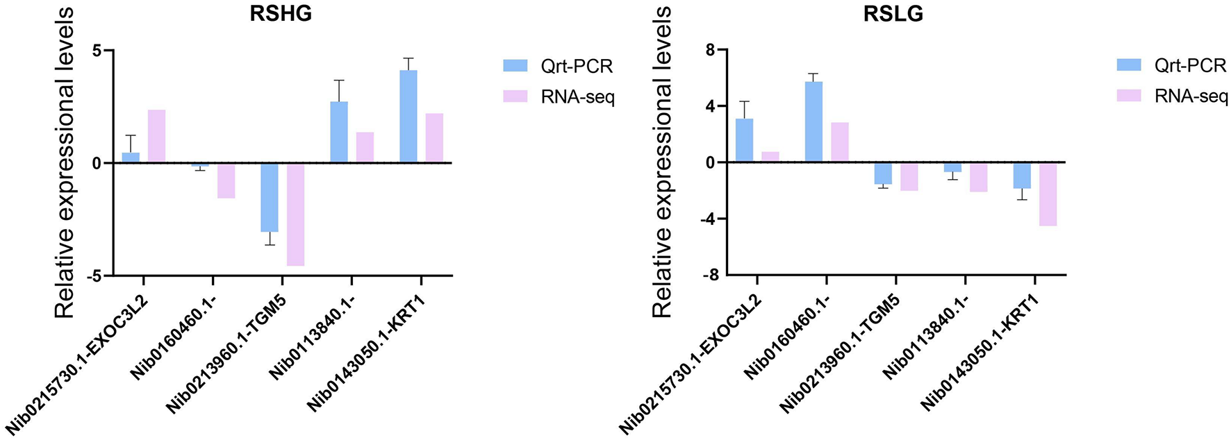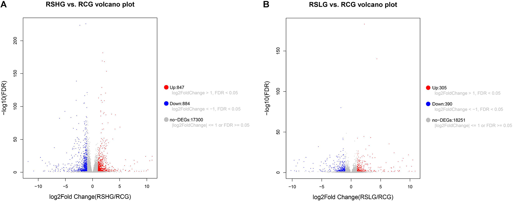 Volcano plot of DEGs. (A) RSHG versus RCG volcano plot; (B) RSLG versus RCG volcano plot.
