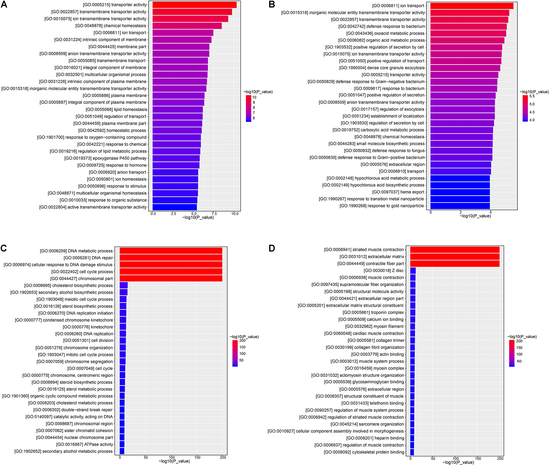 Bar plot of GO function enrichment of DEGs. (A) RSHG versus RCG bar plot of up-regulated DEGs; (B) RSLG versus RCG bar plot of up-regulated DEGs; (C) RSHG versus RCG bar plot of down-regulated DEGs; and (D) RSLG versus RCG bar plot of down-regulated DEGs.
