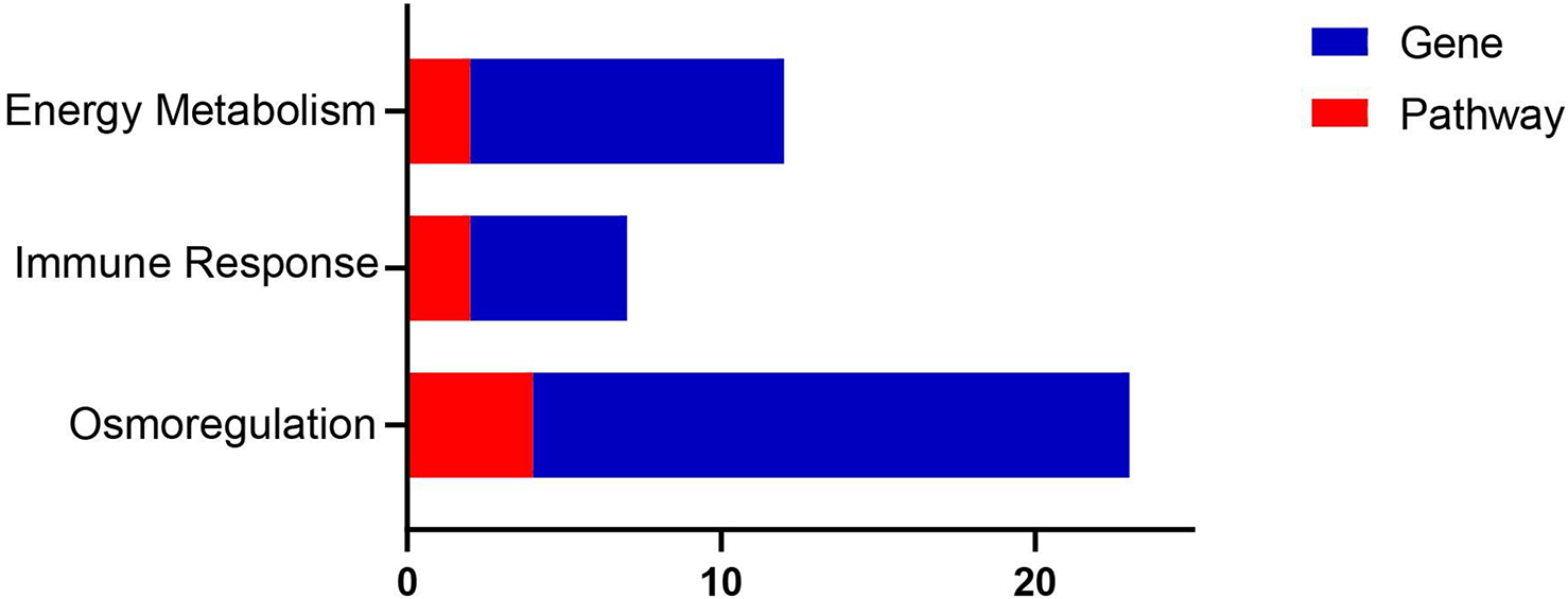 The marine environment is changing rapidly around the world because of global warming (Philippart et al., 2011). Therefore, marine salinity is affected and changed. Salinity, as a key abiotic environmental factor, could affect the survival, growth and development, physiological activities, and immune metabolism of marine fish (Boeuf and Payan, 2001; Wang and Zhu, 2002; Kultz, 2015). Studies have shown some possible differences in the adaptability of different species to salinity changes, and similar species may have different responses to different degrees of salinity changes (Romano and Zeng, 2006; Ye et al., 2009). Several differentially expressed genes (DEGs) and pathways involved in salinity changes have been identified in many species, such as Oratosquilla oratoria (Lou et al., 2019), Rachycentron canadum (Cao et al., 2020), Crassostrea gigas (Zhao et al., 2012), Eriocheir sinensis (Li et al., 2014), Exopalaemon carinicauda (Shen et al., 2020), and Nibea japonica (Meng et al., 2020). At present, more macroscopical studies on A. japonicus are available than those on the adaptive mechanism and the expression of functional genes and their regulatory pathways in response to salinity fluctuation.
