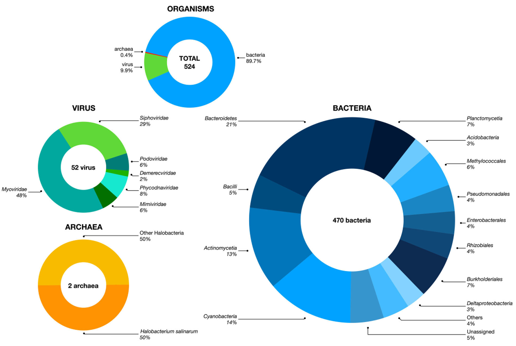 Microbial diversity of the Guarapiranga reservoir. Five hundred twenty-four species were identified in the sample. Bacteria were the most abundant microorganism (470) represented by at least 44 phyla, followed by 52 viruses of at least six families, and two archaea. For a full list see Supplementary File 1.