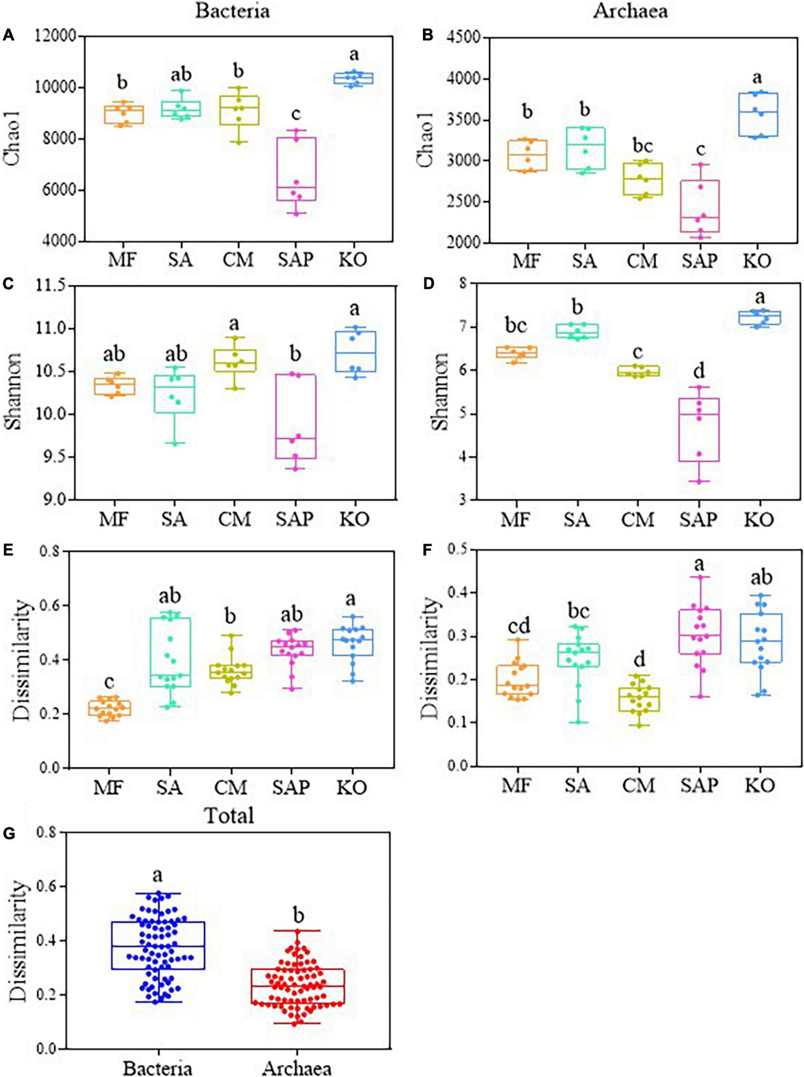 The α-diversity (Chao1 and Shannon indices) of bacterial (A,C) and archaeal (B,D) communities in the coastal wetland. The β-diversity within one site was based on the Bray–Curtis distance of bacterial (E) and archaeal (F) communities. Different lowercase letters indicate a significant difference at the level of P < 0.05 (n = 6).