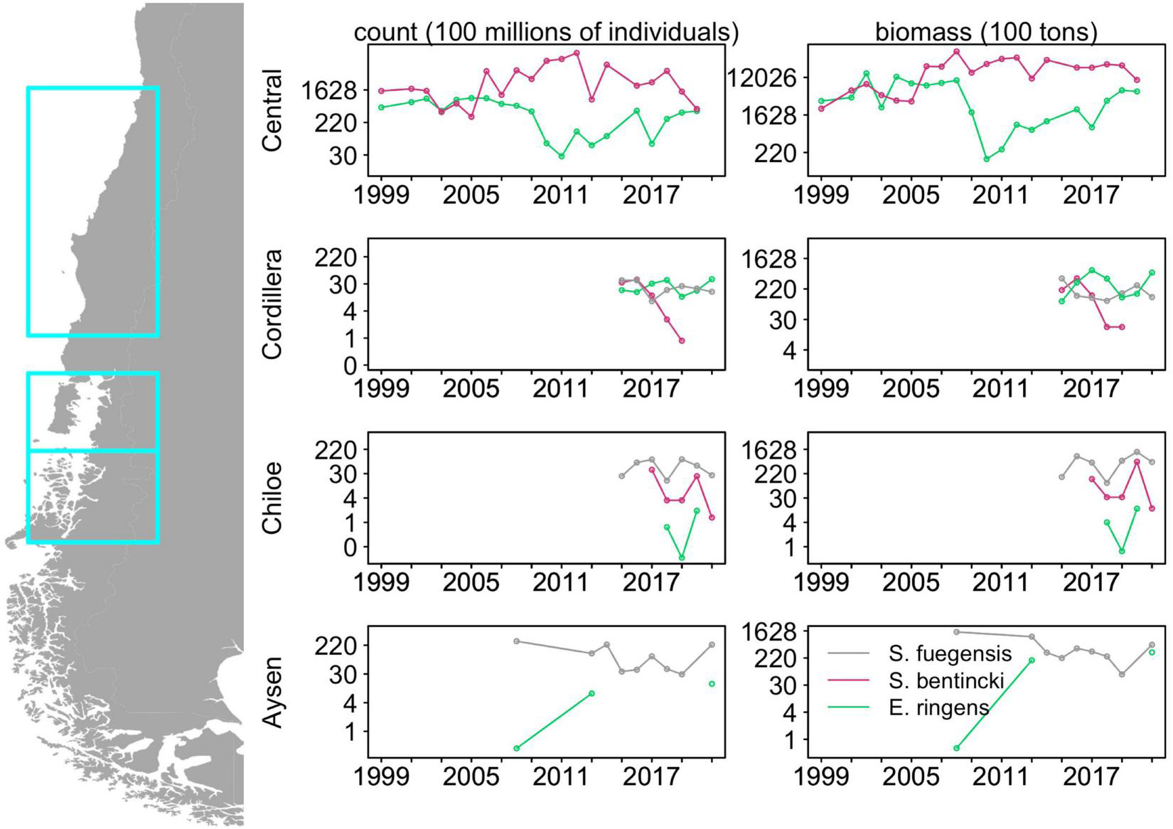 Historical abundances and biomass for the three fish species in Central Chile (32°40′S to 40°20′S), Chiloé and Cordillera (41°30′S to 43°55′S) and Aysén (43°55′S to 46°44′S) derived from acoustic surveys. Note the log scale in the y-axis. Data were provided by Jorge Castillo from the Instituto de Fomento Pesquero. See Supplementary Table 5 for associated abundances and biomass data.