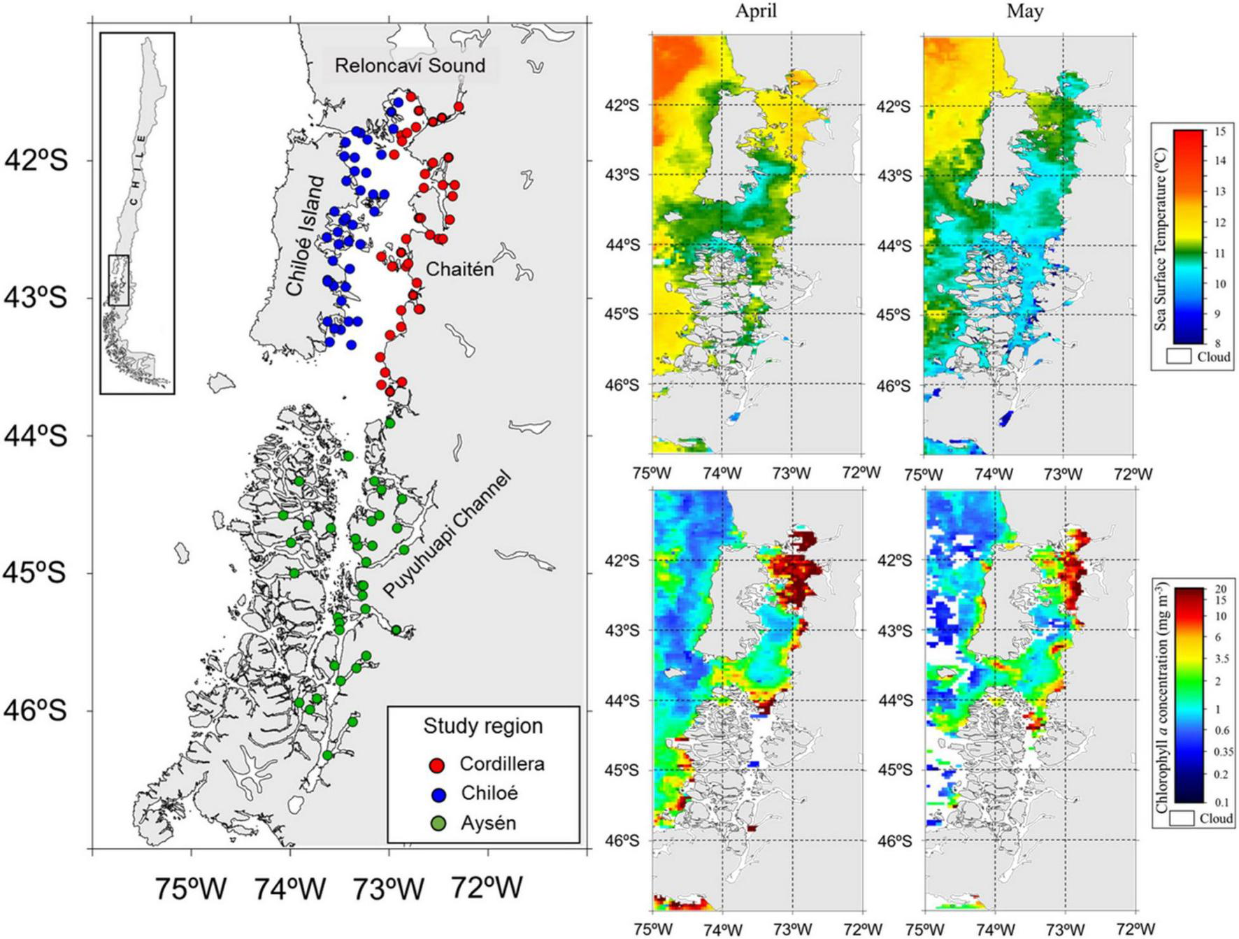Study area (left panel) in Northern Chilean Patagonia with zooplankton sampling stations in the three regions during cruises in April and May 2019. On the right, satellite images showing the sea surface temperature (°C, top) and chlorophyll a concentration (mg m–3, bottom) during the sampling period from April to May 2019. Source: http://oceancolor.gsfc.nasa.gov.