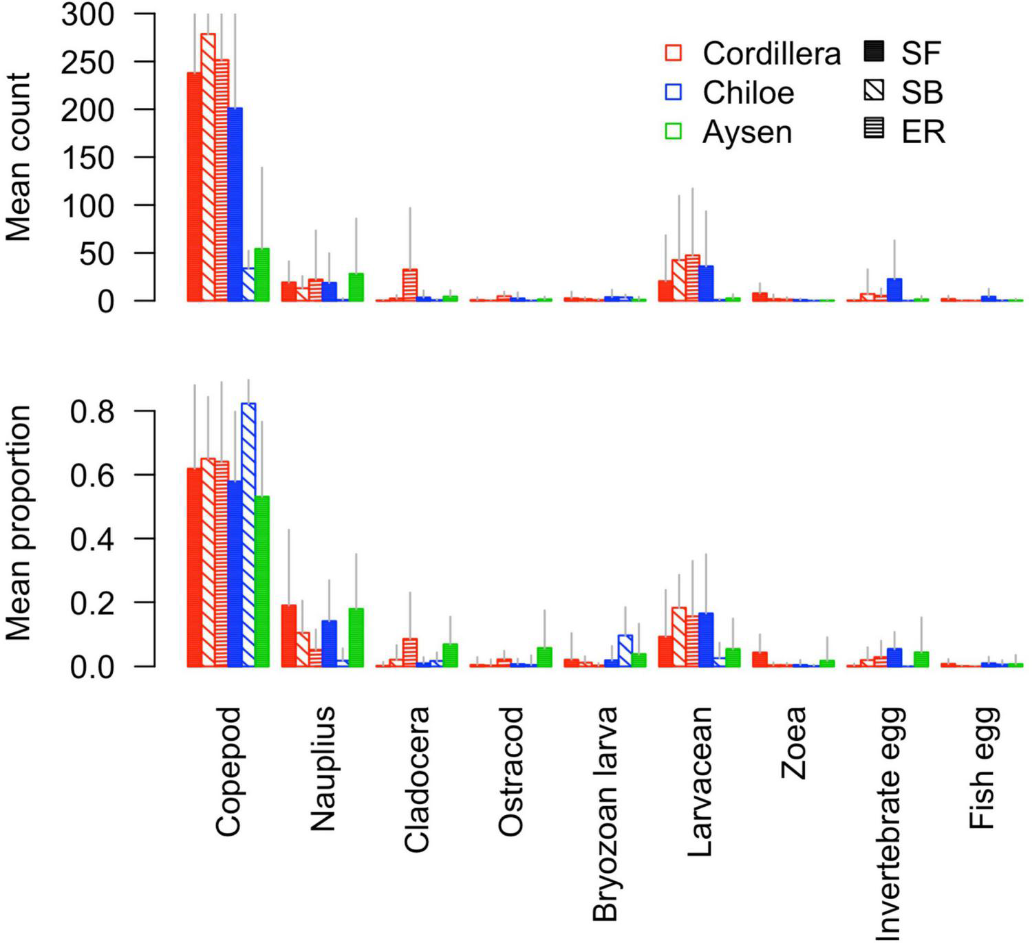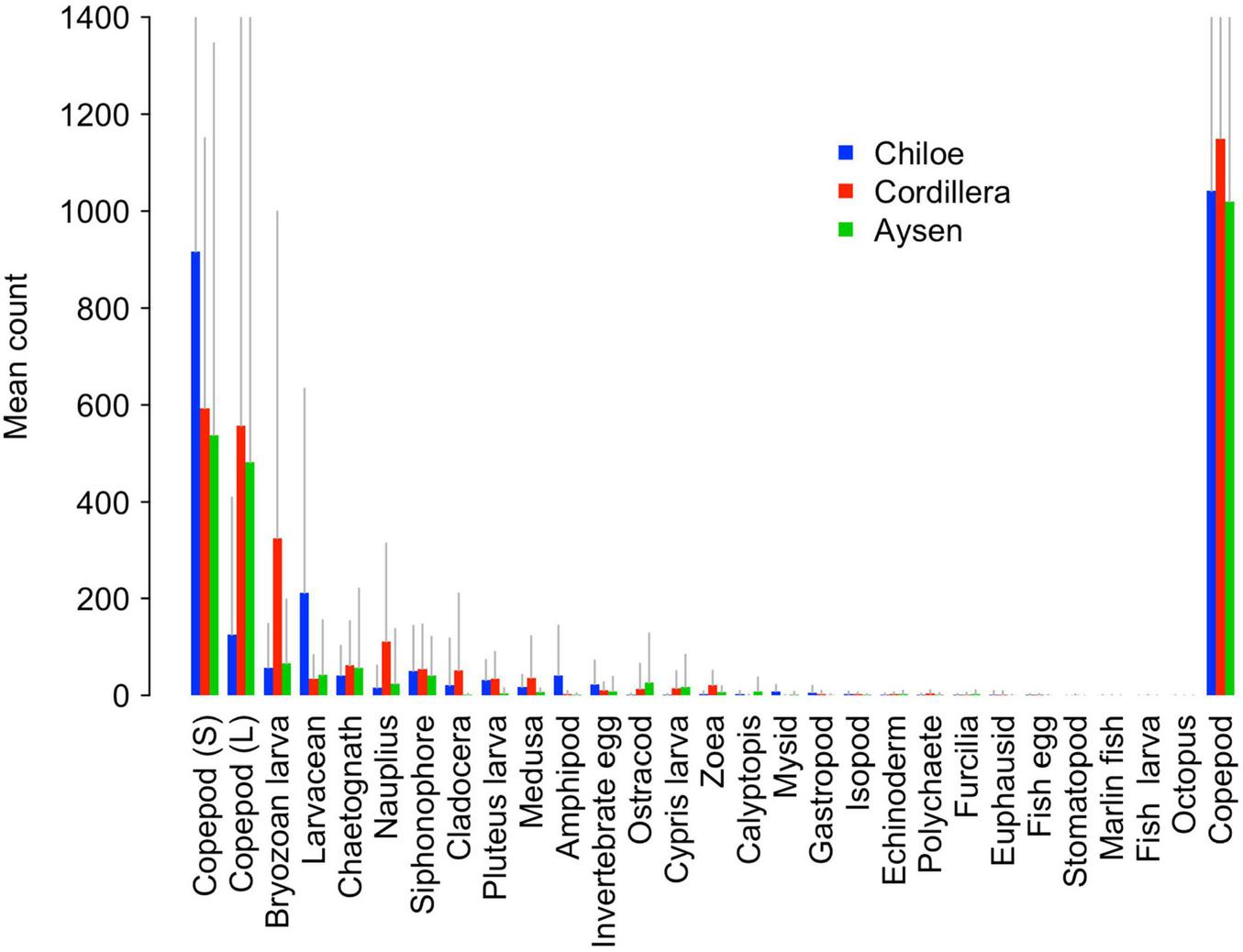 Barplot of mean counts of zooplankton in Cordillera (red), Chiloé (blue), and Aysén (green). Gray lines represent positive standard deviations. The copepod category on the far right represents the pooled value for large (L) and small (S) copepods.
