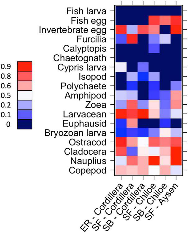 The regions were significantly different from each other in terms of taxa abundances (Table 2). The taxa that drove the differences between the three regions were the bryozoan larvae, amphipods, larvaceans, pluteus larvae, and mysids (Table 2). They respectively explained, 15, 14, 11, and 8% of the total deviance (Table 2). The large copepods explained 3.5% of the deviance and the small ones 1.8%. Chiloé, besides having a lower abundance of large copepods than the other two regions, had significantly more larvaceans and amphipods, whereas Cordillera had significantly more bryozoan larvae, nauplius, and zoea (Figure 4 and Table 2).
