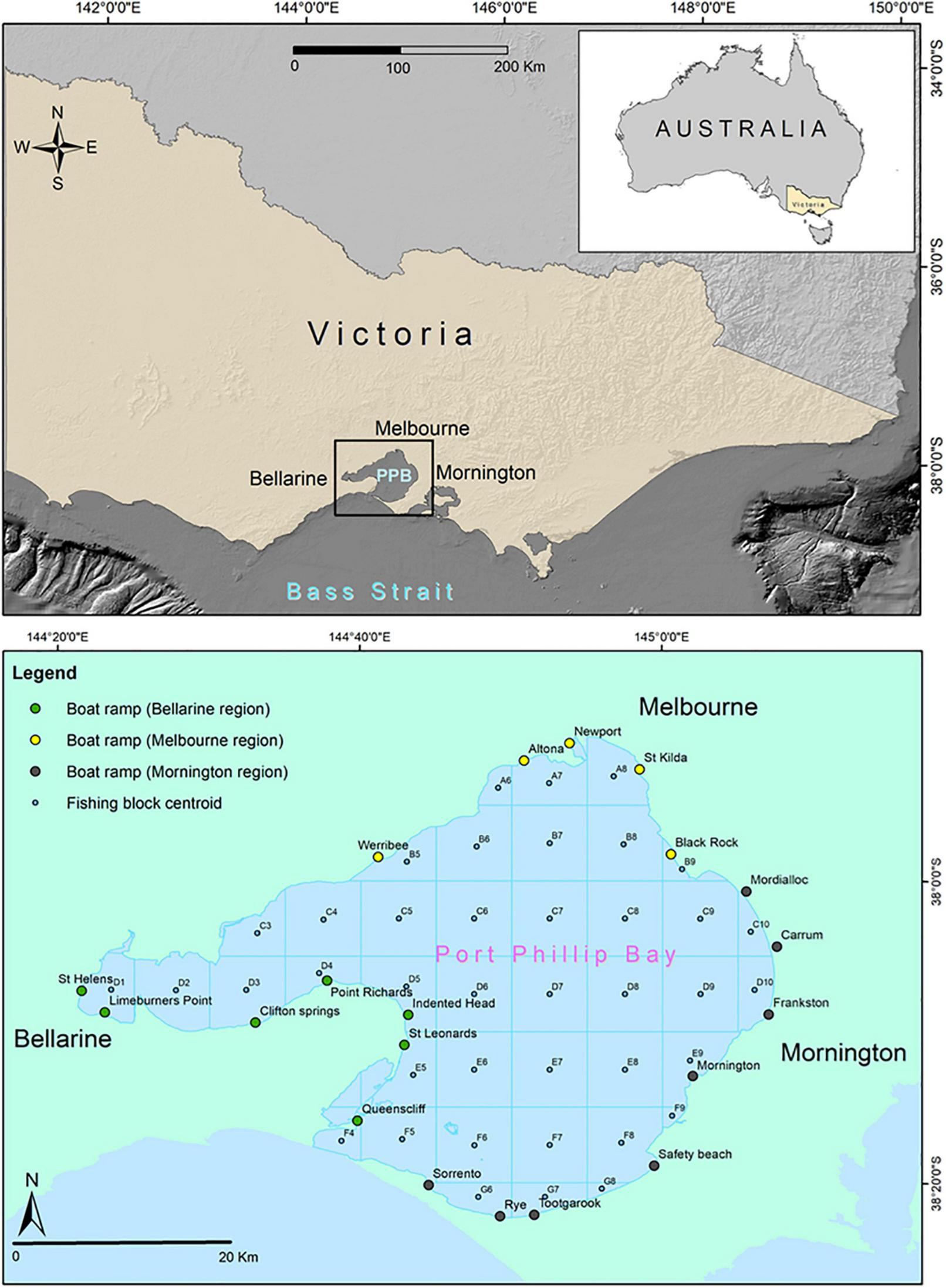 Map of the study area overlaid across the shaded relief of land and sea, zoomed over the State of Victoria and Port Phillip Bay in the lower panel showing the three residential regions of Bellarine, Melbourne and Mornington. Fishing block codes and boat ramp names are also shown.