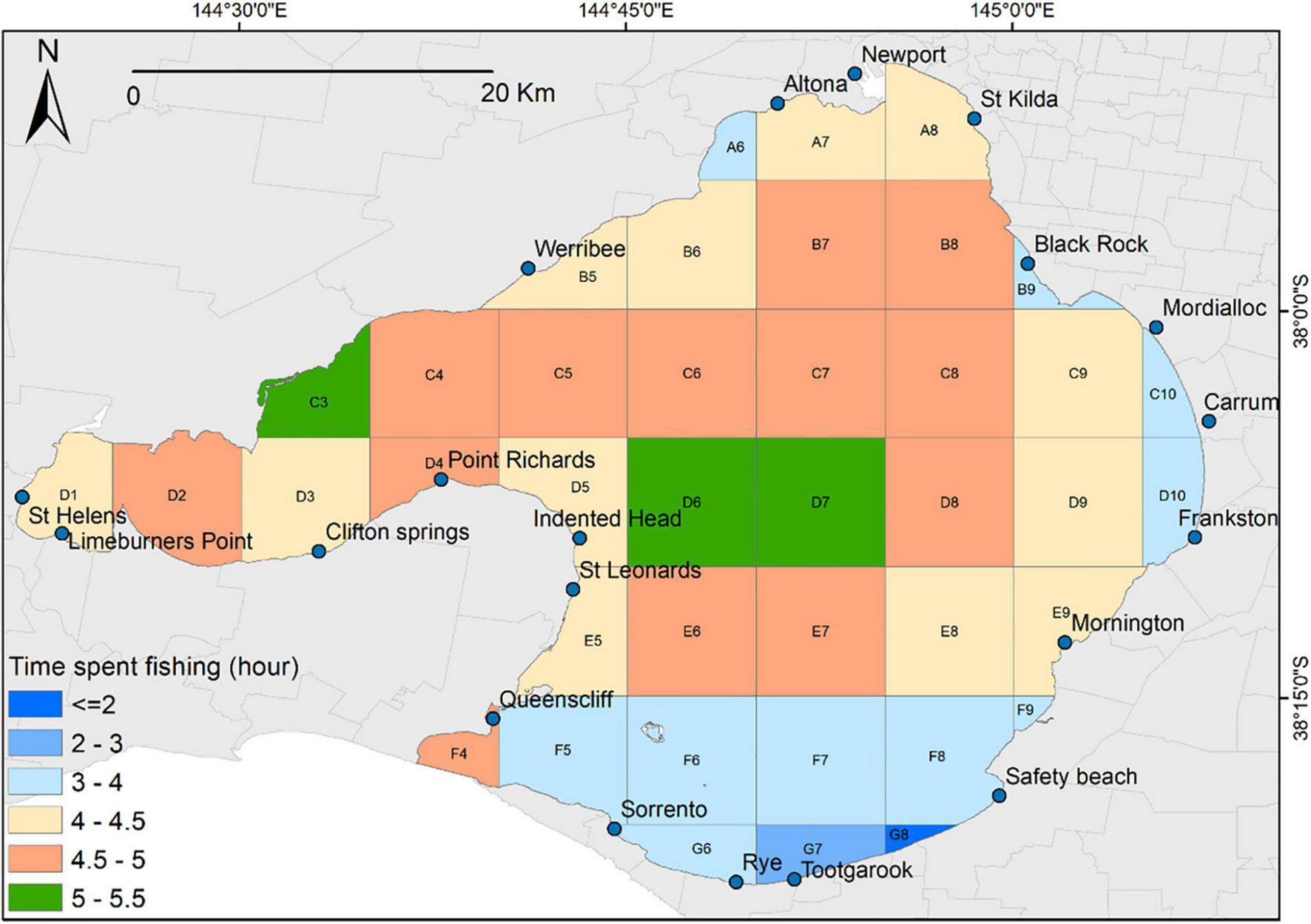 Average amount of time (hours) spent fishing per fishing block in Port Phillip Bay based on the data pooled among years and species.