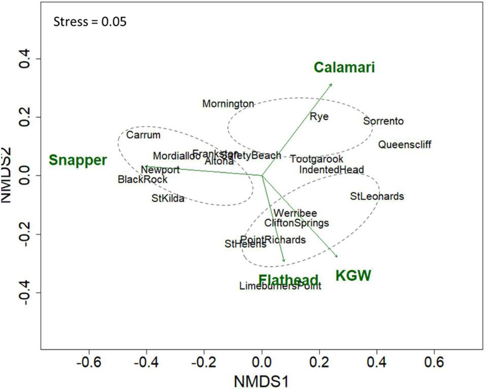 Ordinations of nMDS analyses illustrating patterns of four main target species across boat ramps based on the survey data combined across years. Ellipses represent 95% confidence intervals further indicating the clusters of boat ramps deriving patterns in target species.