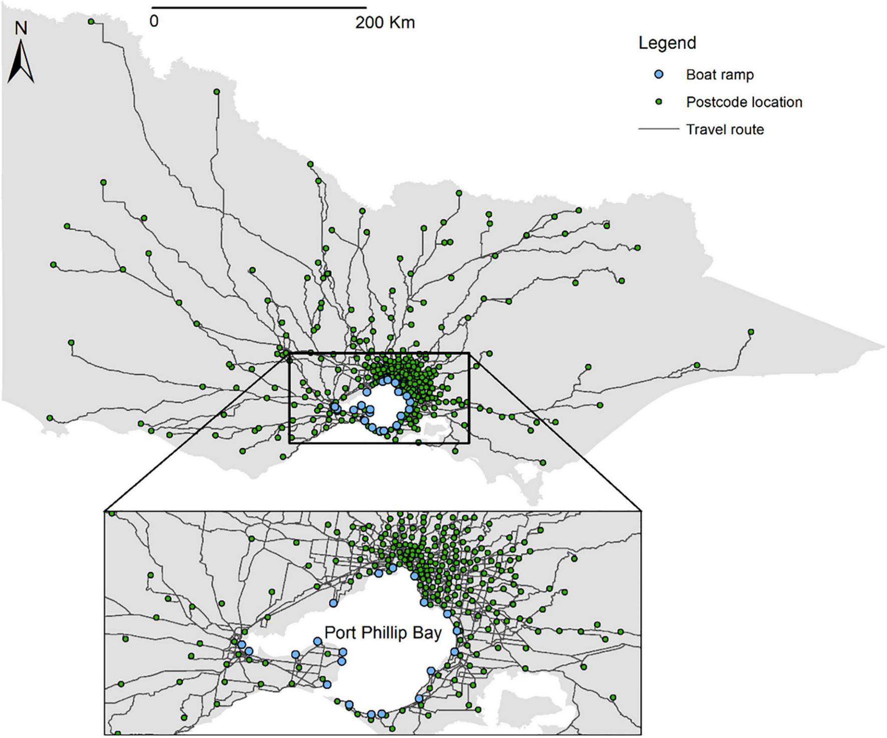 The centroid of each angler’s postcode polygon was generated in ArcGIS (version 10.7, ESRI) to provide proxies for anglers’ residential postcode. Travel distance was calculated across two separate networks of land and water using the origin-destination (OD) cost matrix in ArcGIS Network Analyst. The OD cost matrix identifies and measures the least-cost paths along the network from multiple origins to multiple destinations (Abrahamsson, 1998; Bera and Rao, 2011). To develop a land network, the Vicmap transport road network dataset2 for the state of Victoria was obtained to calculate land travel distance (km) from each angler’s residential postcode to the destination boat ramps. The origins in the road network were the nearest road to the centroid of each postcode polygon and the destinations were the boat ramp locations of the creel surveys. After creating origin-destination routes, results were validated by randomly selecting the network analysis outputs and comparing these with the Google Maps application, a web mapping service developed by Google as a reliable and popular mobile application for route planning3.