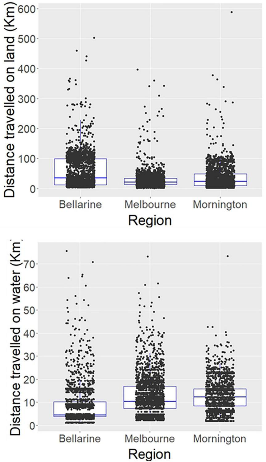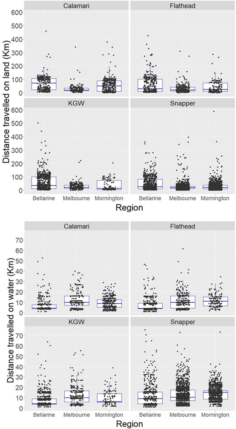 Regional patterns (Bellarine, Melbourne and Mornington) in angler travel distance on land and water pooled among species and years. Each dot indicates an angler trip.