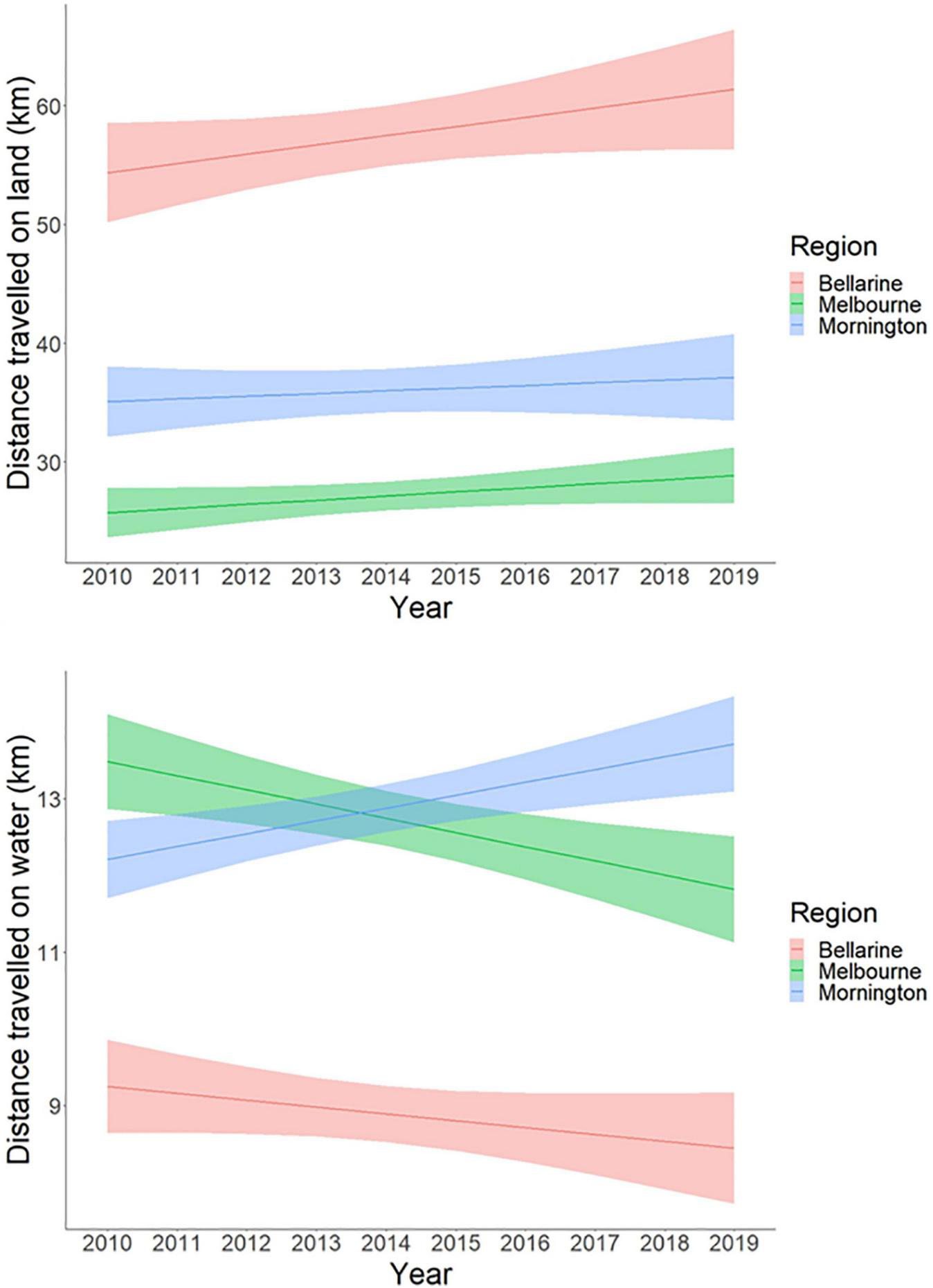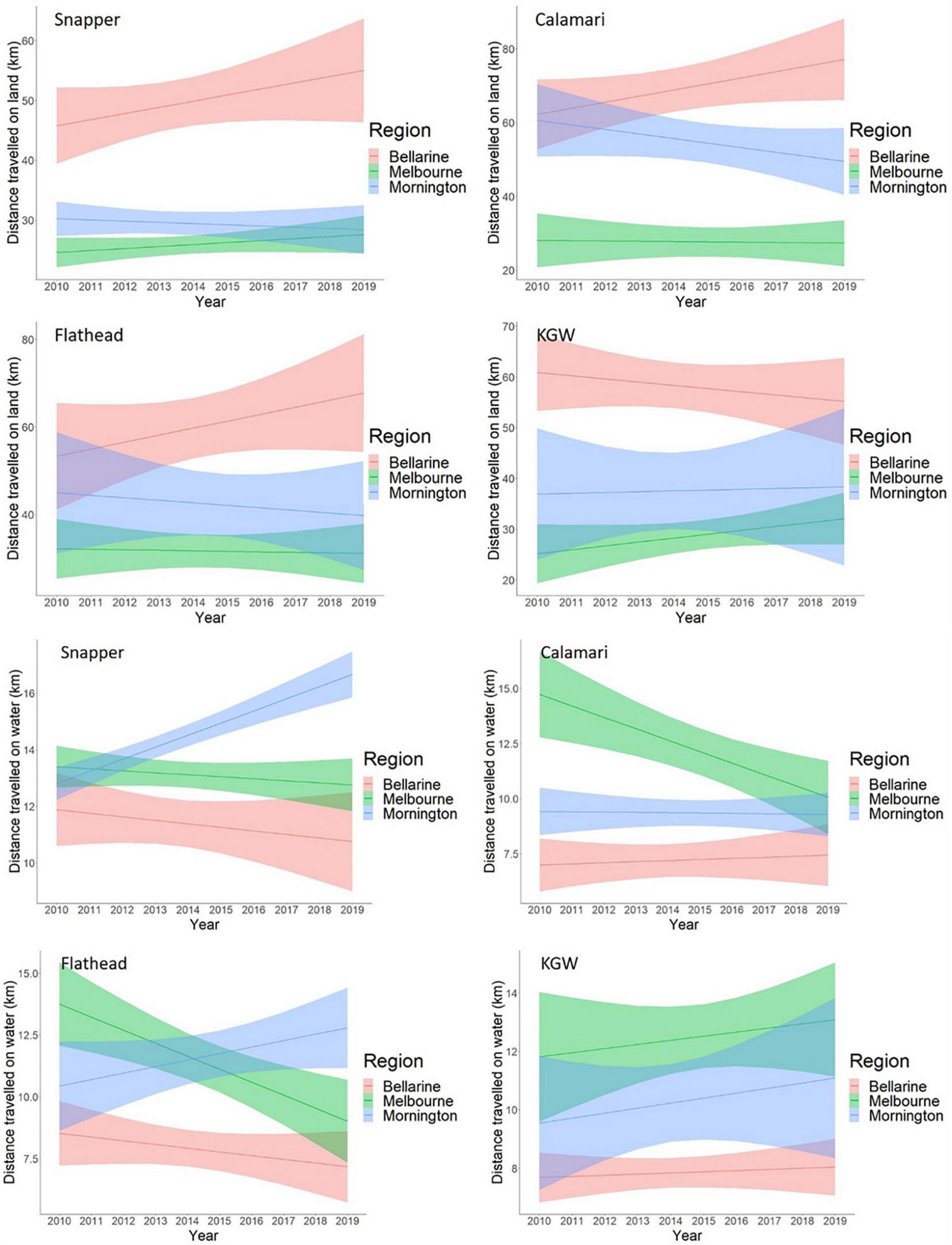 Temporal (annual) assessment of travel distance on land and water revealed significant variation by region and target species. Travel distance on land increased through time in the Bellarine region, but the travel distance on water remained shorter compared to the Melbourne and Mornington regions (Figure 8). Relatively similar annual trends were evident when travel distance patterns were compared by region and target species (Figure 9), revealing longer travel distance on land, and shorter distance on water for anglers from Bellarine, though some trends did not appear to vary through time. Interestingly, an increasing annual trend in travel distance on water occurred for anglers launching from Mornington who targeted highly mobile snapper, whereas a decreasing annual trend in travel distance on water was detected for anglers launching from Melbourne who targeted southern calamari and flathead (Figure 9). There were clear consistencies in land and water travel distance trends for anglers from Melbourne and Mornington for flathead and KGW.