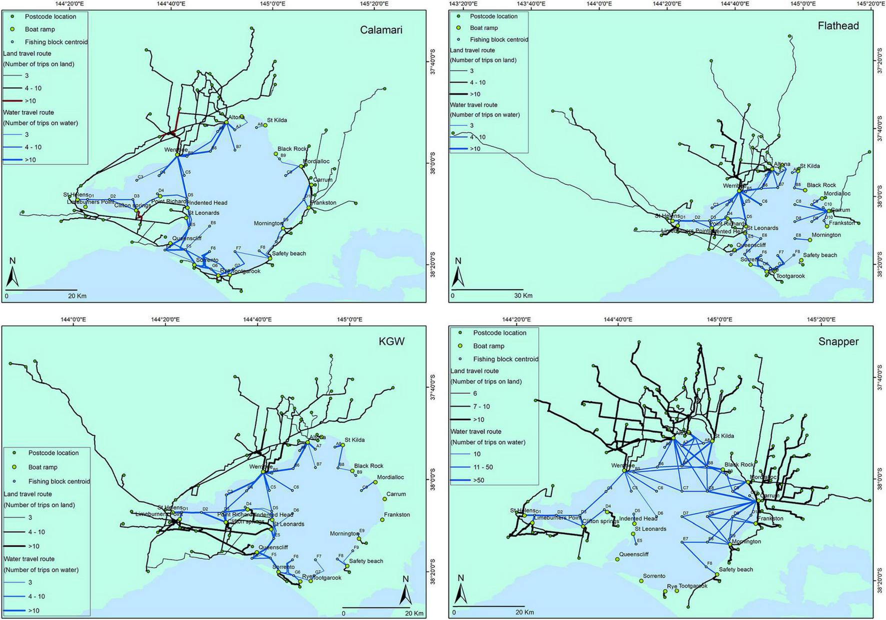 The most popular fishing trips by postcode to boat ramps and fishing blocks revealed over 80% of fishing trips were the same on water and about 50% the same via land (Figure 10). Most of the popular travel routes over land and water for snapper occurred in the east and north of PPB by anglers residing mostly in the Melbourne metropolitan area. Their fishing trips on water were predominately in the northern and eastern parts of PPB and ventured further into the deeper central areas of PPB (Figure 10). Different trip patterns on land and water were evident when anglers targeted calamari as most of these anglers were from postcodes in the west, north and southeast of PPB, and most of their fishing trips occurred in shallow inshore waters in the south and western areas of PPB (Figure 10). In contrast, fishing trips targeting flathead and KGW were popular among anglers from postcodes from suburbs farther north and west of PPB (Figure 10), and fishing trips on water were also dominated in the north and west, with anglers who were targeting flathead generally traveling further into deeper water.