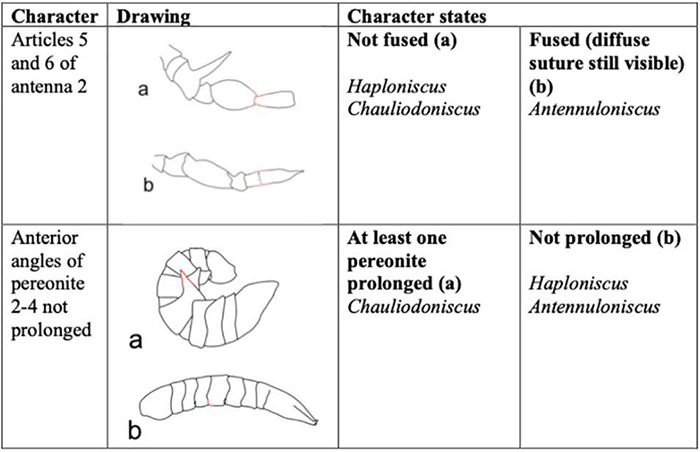 Furthermore, four head shapes are found in the species: (1) half circular (H. aduncus, H. ampliatus, H. bicuspis and H. borealis) (2) trapezoid (H. hamatus) (3) slightly concave (H. foresti) and (4) rectangular (H. astraphes). Furthermore, the absence (H. angustus, H. foresti, H. spinifer and H. astraphes) or presence (H. ampliatus, H. aduncus, H. bicuspis, H. borealis, H. hamatus) of the rostrum was used as another distinguishing character. In addition, of the species with a rostrum, its length- and width ratio differs between species. In some species (H. aduncus and H. hamatus), the rostrum is longer than wide, while in others (H. ampliatus, H. bicuspis, H. borealis), the rostrum is at least as wide as long or even wider than long. The species can also be categorized into two different types of pleotelson fusion: (1) the pleotelson is fused with sixth and seventh pereonite (H. aduncus, H. foresti); or (2) the pleotelson is only fused with the seventh pereonite (H. ampliatus, H. angustus, H. astraphes, H. aduncus, H. borealis, H. bicuspis, H. hamatus, H. spinifer). Finally, comparing the ratio of the head length (without rostrum if present) relative to the first segment length can be used to differentiate between the nine different Haploniscus species. The length of the first segment either fits over 1.5 times (H. aduncus H. angustus, H. astraphes, H. bicuspis) or under 1.5 times into the head length (H. ampliatus H. borealis, H. foresti, H. hamatus and H. spinifer). The key was published online: https://doi.org/10.5281/zenodo.5701346.