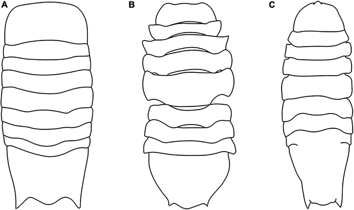 Habitus drawing of Antennuloniscus(A), Chauliodoniscus(B), and Haploniscus(C) (Modified after Lincoln, 1985a,b; Brökeland and Wägele, 2004).