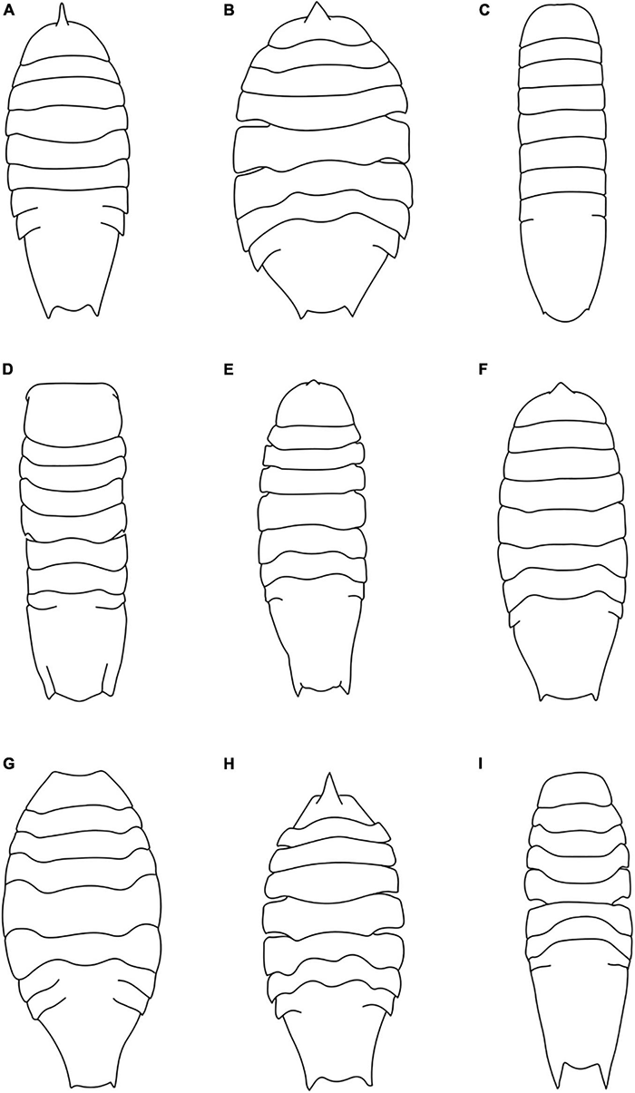 Habitus drawings of Haploniscus aduncus (A)H. ampliatus(B)H. angustus(C)H. astraphes(D)H. bicuspis(E)H. borealis(F)H. foresti(G)H. hamatus(H)H. spinifer(I) (Modified after Brökeland and Wägele, 2004; Brökeland and Svavarsson, 2017).