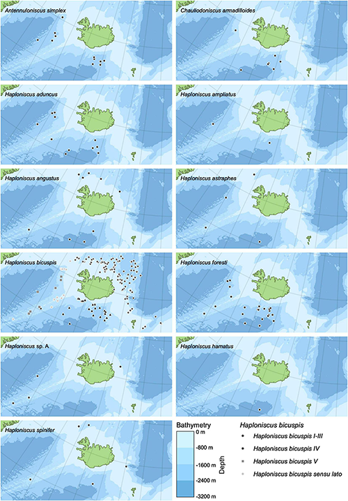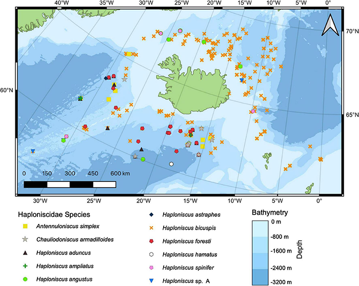 Distribution of all Haploniscidae species found around Iceland collected during the BIOICE and IceAGE projects (Source for bathymetry: GEBCO Bathymetric Compilation Group, 2020).