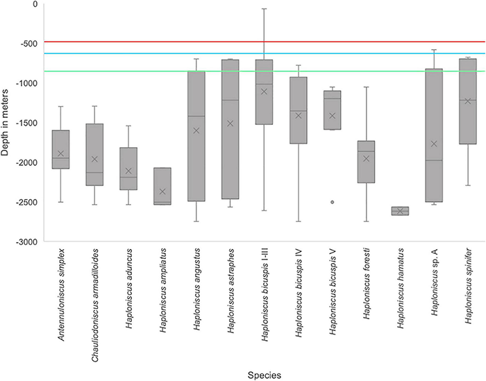 Species found only in the south of the GIF ridge and those found north of the ridge showed some differences in bathymetric distribution; most southern species (A. simplex, C. armadilloides, H. aduncus, H. ampliatus, H. bicuspis V, H. foresti and H. hamatus) were only found in a depth deeper than 800 m, except H. bicuspis IV which is present between 778 and 2850 m (median: 1412 m). In contrast, H. angustus, H. astraphes, H. bicuspis V, H. spinifer and H. sp. A, whose distribution is either limited to the north or that occur on both sides of the ridge, can also be found above 800 m.