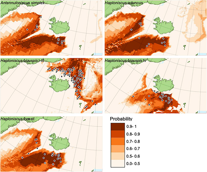 Statistically significant species distribution models of Haploniscidae species around Iceland.