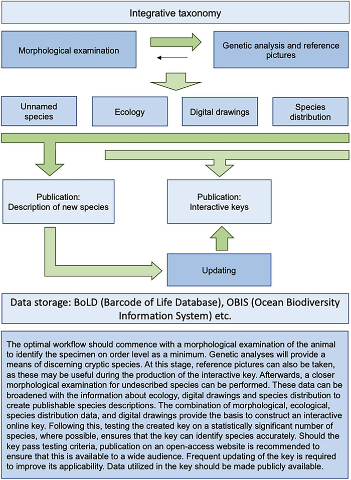 In the last two decades, major leaps have been made in the development of taxonomic approaches and methodologies, including DNA-based taxonomy and (meta-) barcoding, “-omic” techniques, imaging tools, and integrative approaches linking different types of taxonomic information (Dayrat, 2005; Boistel et al., 2011; Raupach et al., 2016; Paulus et al., 2021). Many of these methods, despite their apparent advantage in facilitating and accelerating species delimitation, have been slow to find their way into deep-sea taxonomy. However, with increasing human impacts on deep-sea ecosystems, new methods and ideas for identifying and delimiting species are urgently needed (Brix et al., 2020).