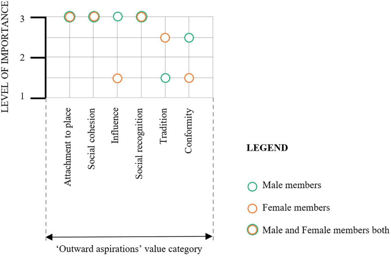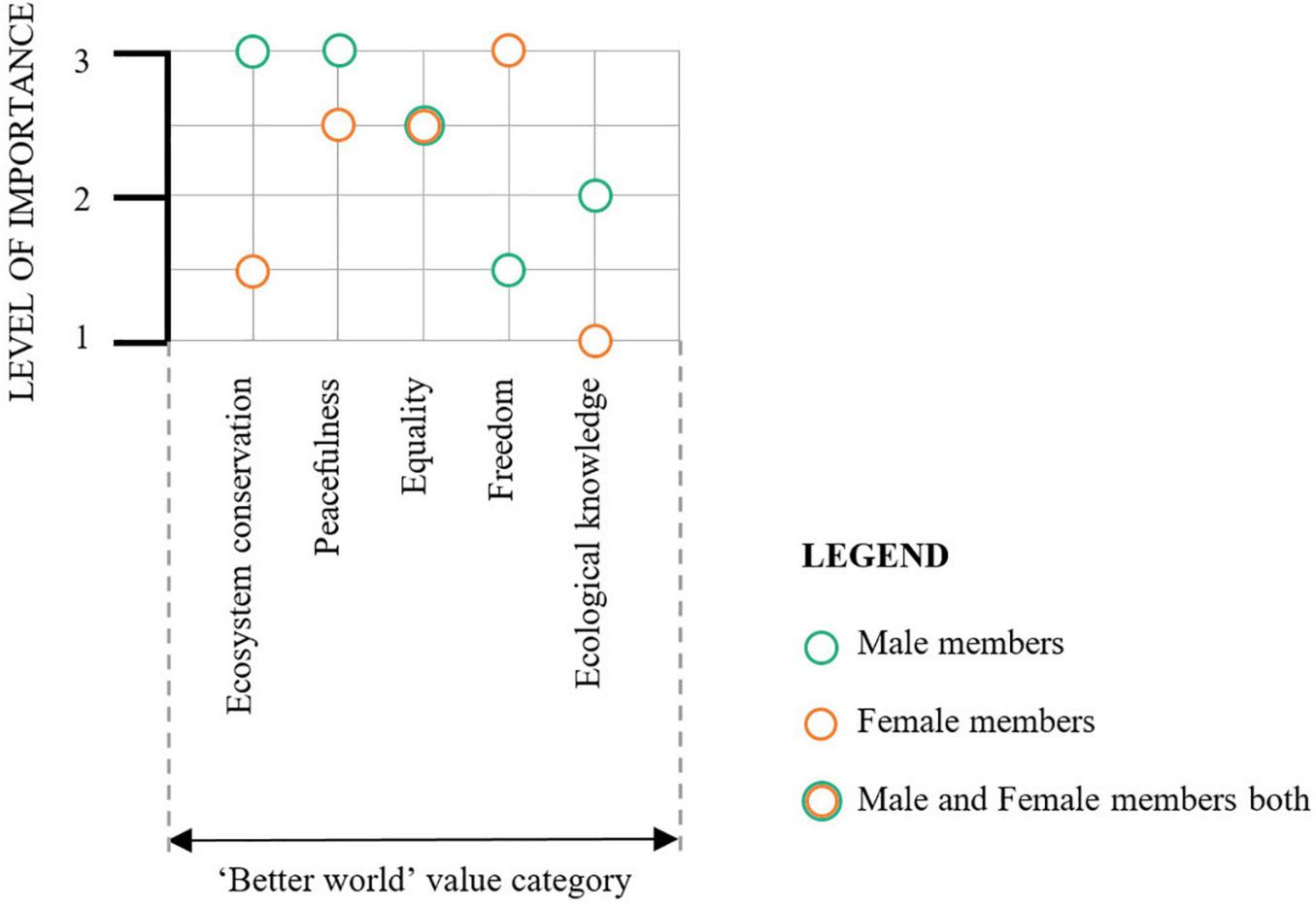 Importance hierarchy of “better world” value types in the small-scale fishery and dried fish production of Sagar Island based on the male and female fishers and dried fish producers who judged each value (note that 1 implies “not important”, 2 implies “somewhat important”, and 3 implies “very important”). Data are from household surveys answered by fishers and dried fish producers of Sagar Island.