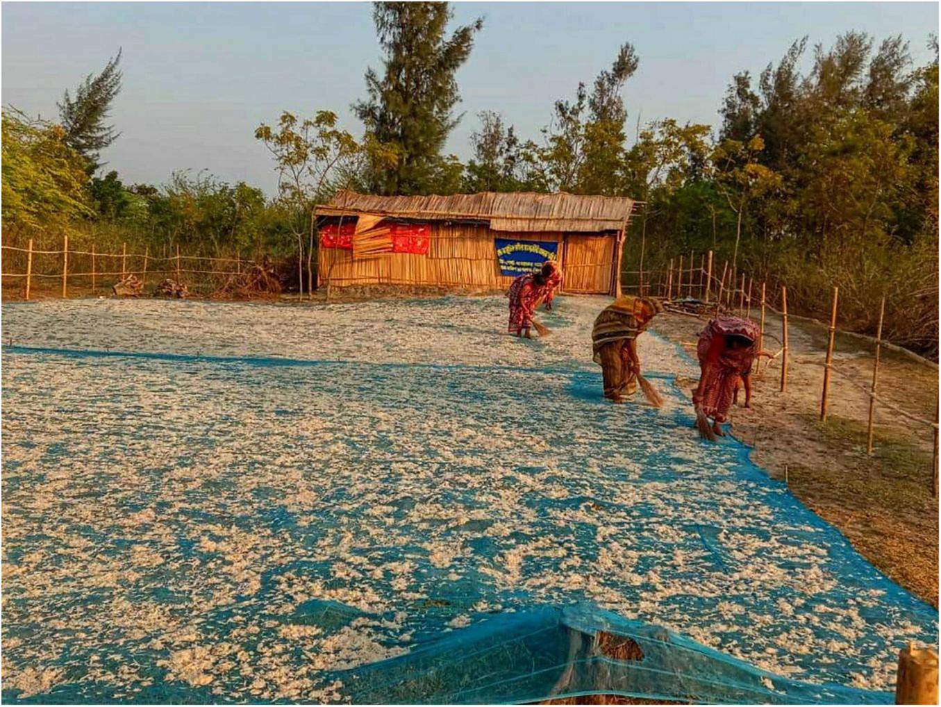 Primary data collection for the present study was undertaken in two parts. In the first round, a household survey was conducted using a household questionnaire through snowball sampling (i.e., the process by which previous participants identify new participants) covering 45 households. In the second round, 45 fishers/dried fishers (25 males and 20 females) were identified among the households covered in the first round and were interviewed following a semi-structured interview schedule. Further, focus group discussions (n = 2 with a total of 33 participants) were carried out in the study area itself. We followed three-point criteria in shortlisting the participants. For the present study, the respondent must (1) be a legal resident of Sagar Island; (2) practice fishing in the sea, creeks, and estuarine rivers with wooden boats (non-motorized boats and 2-, 4-, and 6- cylinder boats) or homemade Styrofoam floating boards; and (3) be a dried fish producer.