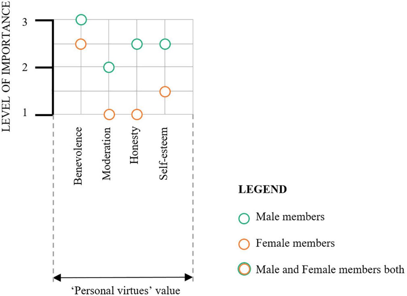Table 2 demonstrates the socio-economic profile of the respondents. It is good to note that owning a boat on the island does not mean that the owner necessarily is running a fishing business. During the interviews, many participants stated that they alone could not afford the cost of one particular fishing voyage; therefore, they share their boats among family members to offset the cost. Further, fishing is primarily a combined effort, with two to three fishers working together (CARICOM, 2000). In the case of boats with four or less than four-cylinder capacity, the boat captain (i.e., the owner) takes a 50% share from the profit, and the remaining share is divided among the rest of the members. But in the case of 6-cylinder boats, the boat captain takes 60% of the share. During data collection, it was noticed that small-scale fisher households in Sagar Island are also dried fish producers. Also, male members are mainly involved with fishing, and female members are mainly involved with dried fish production (fish drying and processing). In addition, there are different choices male and female fishing members pursue regarding their livelihood and socialization. Therefore, both male and female groups were sampled within each village to gain a breadth of these differences in relation to their values and beliefs. In this research, the semi-structured interview data first underwent a thematic analysis using qualitative coding with the help of NVivo qualitative data analysis computer software. The questionnaire results were quantitatively analyzed using a Microsoft Excel spreadsheet. Inferential statistics (taking data from samples and making generalizations about a population) were attained regarding ranking the most (and least) esteemed thematic values among each male (n = 25) and female (n = 20) fishing community group. The results were coded as 1, 2, and 3 according to the rank they received (i.e., 1 implies “not important”, 2 implies “somewhat important”, and 3 implies “very important”). For instance, it was coded as one if a respondent said that the “honesty” value was not important in terms of its contribution to Sagar Island’s SSF and DF production. Then, the mean values of these codes were acquired by adding all the values together and dividing the result by the number of respondents. The mean values were used to create figures representing the importance hierarchy among the male and female members. These actions have been taken to better compare the value types and emphasize their level of importance. It is also good to note that we have used a grounded approach in this research and presented some noteworthy quotes from the community members to explain their perspective on values and beliefs and also to back up the research findings.