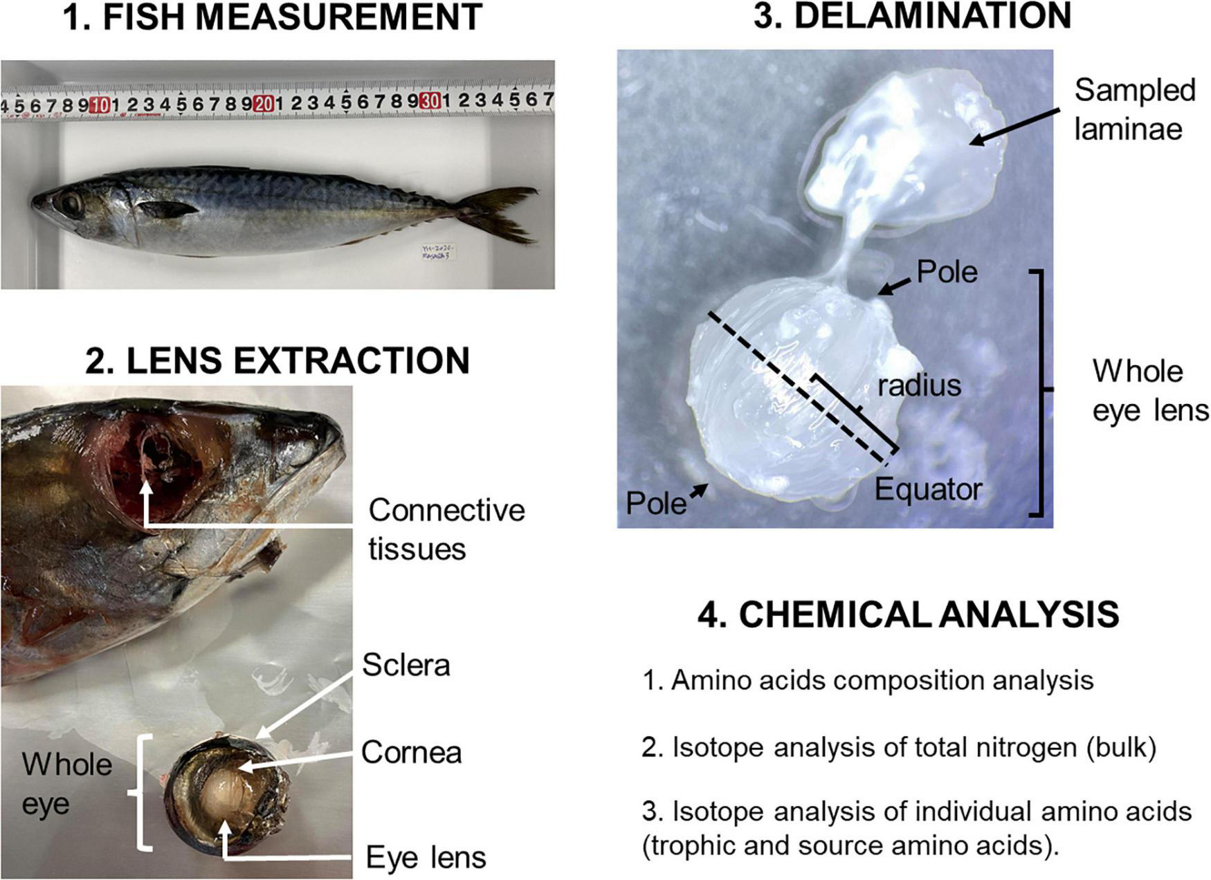 Marine conservation and fisheries science have long recognised the importance of fish migration (Moulton and American Association for the Advancement of Science, 1939). However, the advances in tracking technology and the ecological theory of fish migrations have not been fully integrated into management (Lowerre-Barbieri et al., 2019). In addition to the conventional biologging approach, bio-tracers such as isotopes are increasing in popularity as a tool used to track fish migrations (Matsubayashi et al., 2020). Isotope records in body parts such as lenses, otoliths, scales and vertebrae of fish can be used to reconstruct their diets and movements within isotopically variable environments, providing valuable information for management (Tzadik et al., 2017). In recent years, the application of eye lenses has made particular progress (Bell-Tilcock et al., 2021). Eye lenses of fish are transparent, spherical, and primarily composed of a structural protein called crystallin (Mahler et al., 2013). Like otoliths, lenses are incrementally grown and metabolically inert, recording information over a fish’s entire life (Wallace et al., 2014; Peebles and Hollander, 2020). Lenses contain 66% water, 33% protein and 1% others, including lipids, carbohydrates and trace elements (Feher, 2012). Lens development starts during the early embryonic stage (Grainger, 1992). As fish grow, lens fibre cells are laid down in concentric layers (laminae), similar to the layers of an onion (Wallace et al., 2014; Bell-Tilcock et al., 2021). The lens nucleus (nuclear fibre cells at the centre) is the oldest part of the lens and among the oldest cells in the body. The most recent growth of the fish is recorded in the outermost layer (Peebles and Hollander, 2020). Lenses serve as a focussing device within the eye, therefore, they must be transparent and refractive to allow images to form on the retina (Kröger, 2013). To establish transparency within the lens, cytoplasmic organelles, including the cellular nucleus and its DNA are removed from fibre cells. Following this process, crystallin and other proteins are left behind and de novo protein synthesis ceases (Wride, 2011).