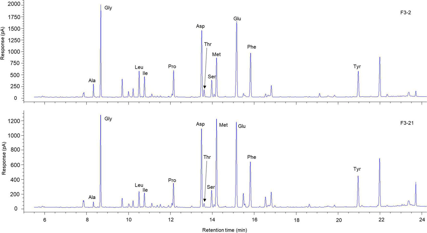 Representative chromatogram of AAs in eye lenses of Chub mackerel. The Met content is substantially higher in the inner laminae, F3-21 (bottom graph), than in the outer laminae, F3-2 (top graph).