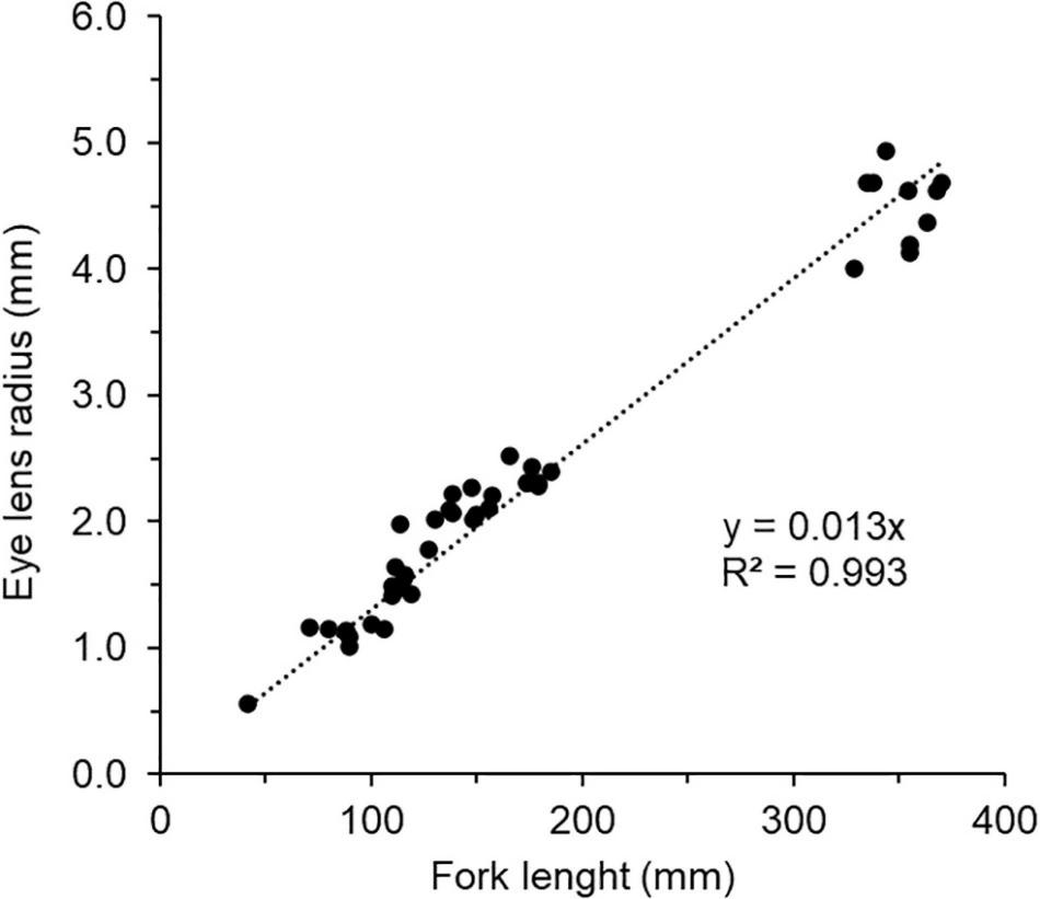 Linear regression of fork length and lens radius of chub mackerel (n = 46). The sample details are shown in Supplementary Table 1.