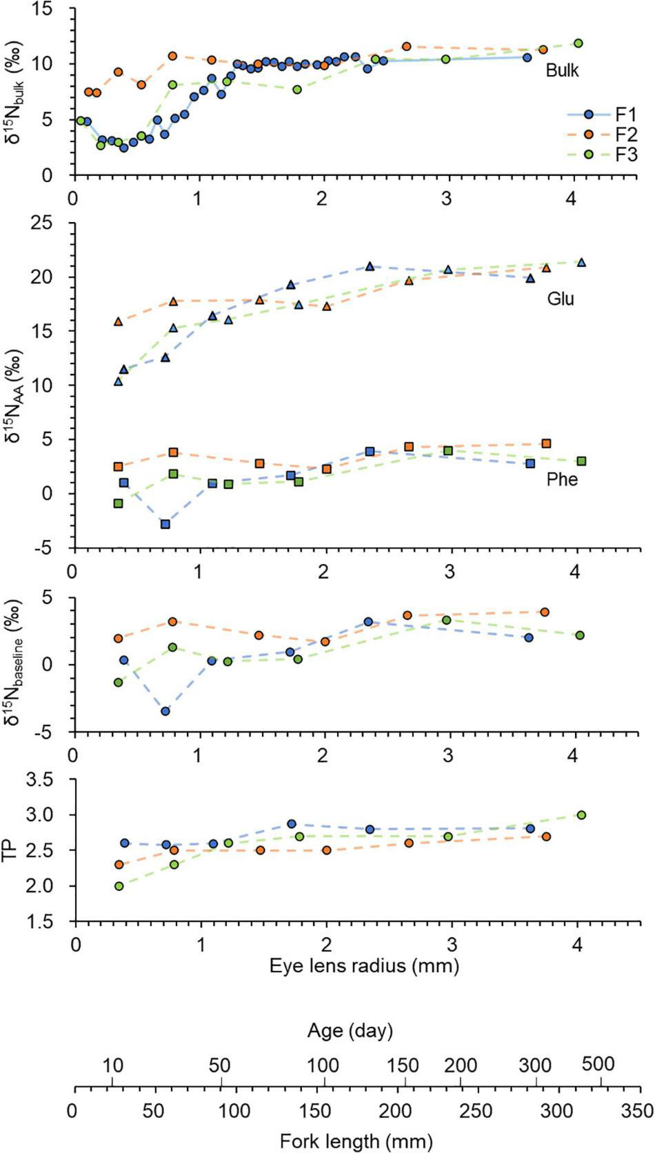 Chronologies of δ15N values measured in eye lenses of Chub mackerel (n = 3), including bulk values and those of individual amino acids (Glu — triangle and Phe — square). The baseline and TP values were calculated using an equation from Chikaraishi et al. (2009) and Xing et al. (2020). Data are plotted against fork length which was estimated using linear regression of fork length and lens radius (Figure 3), and age which was estimated using an equation from Hwang et al. (2008). 34, 33, and 33 laminae were obtained for F1, F2, and F3, respectively. However, only selected laminae were analysed. The solid line indicates continuously analysed laminae, and dotted lines indicate discontinuously analysed laminae.
