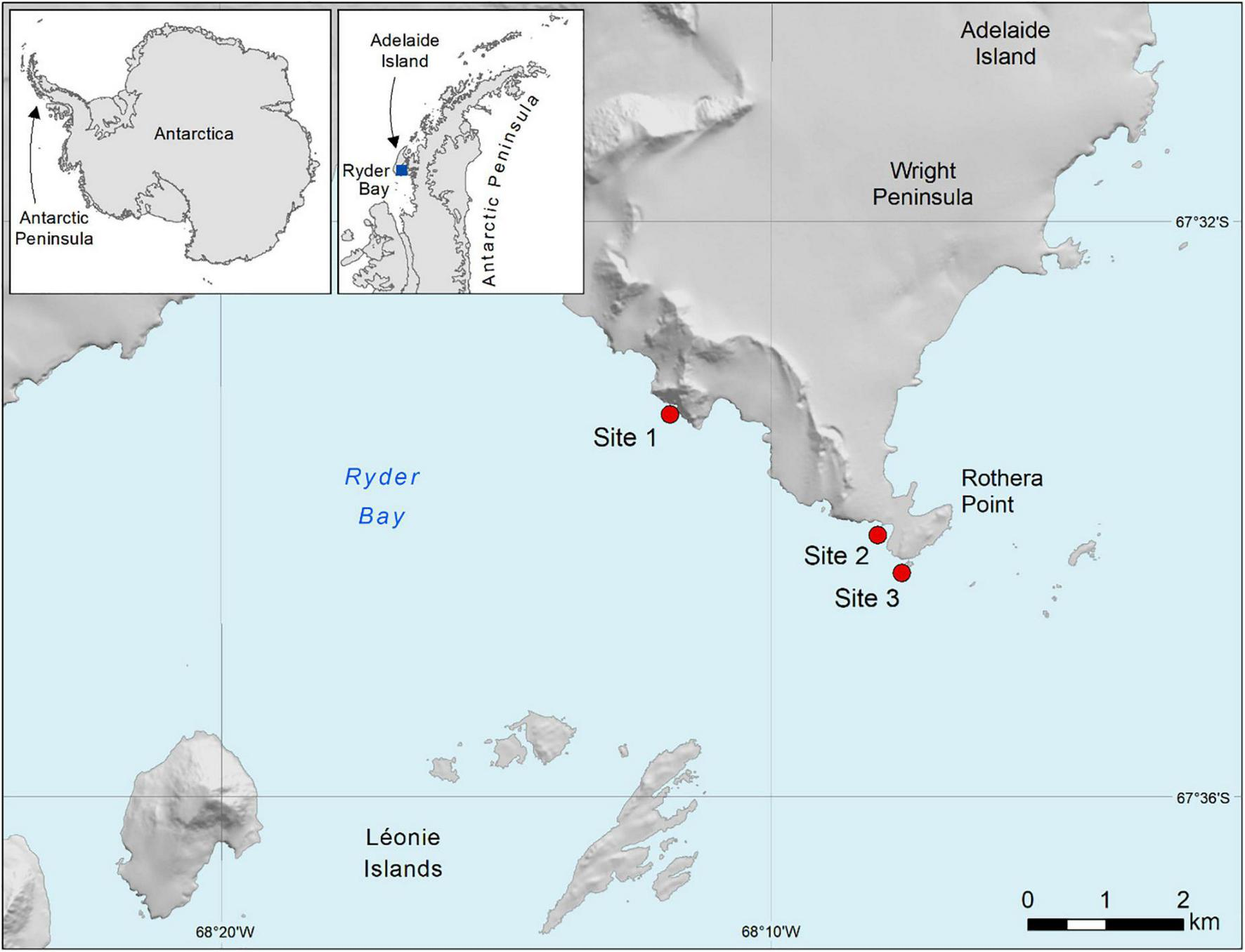 Map of the study area (sample sites are in red) in the Western Antarctic Peninsula, each site is a steep rock slope on Adelaide Island (67°35′S, 068°07′W). Map Modified from Robinson et al. (2021).