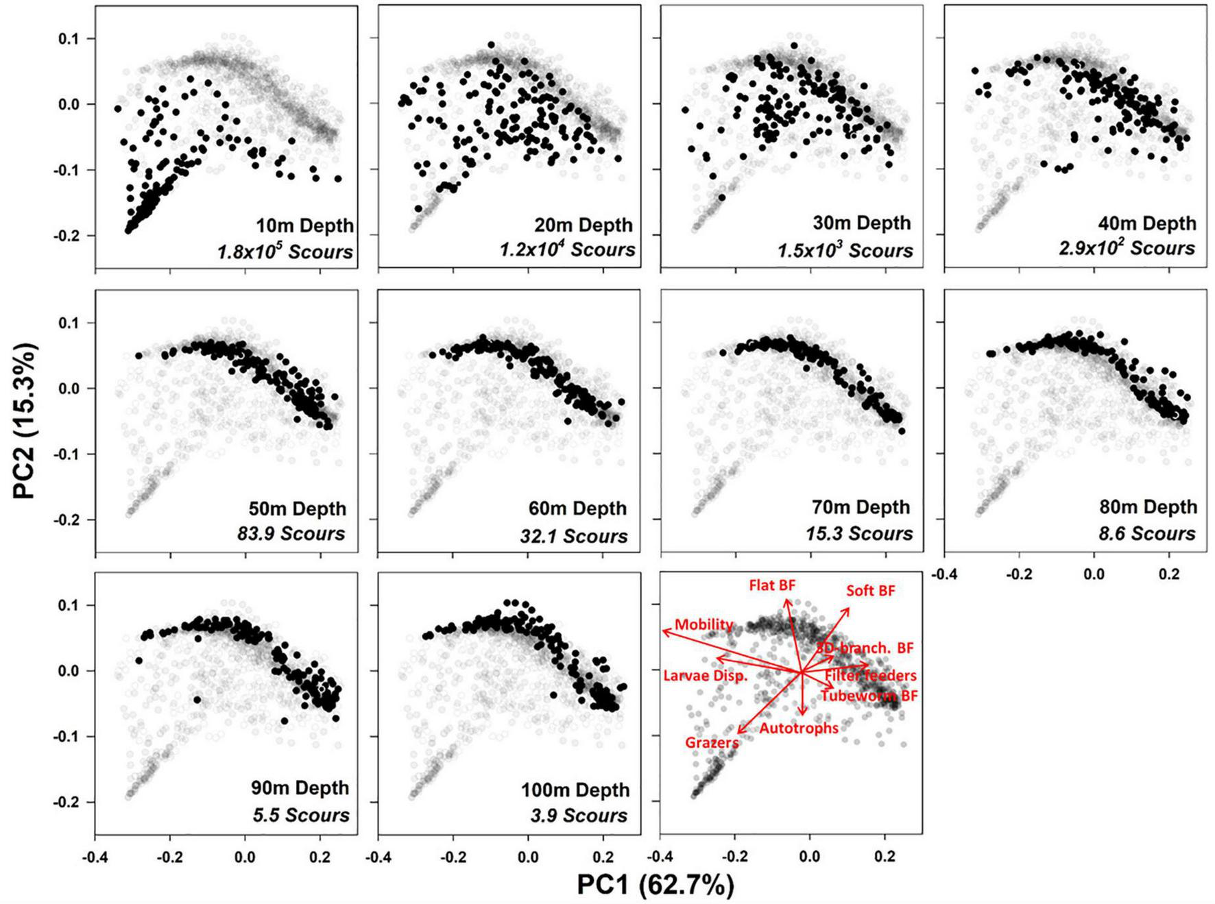 Principal Coordinate Analysis of Community Weighted Means of all Functional Traits with selected set of vectors displayed. Each black circle is a sample at the designated depth. Greyed out samples are from all depths. Principle coordinate 1 and 2 axis explain variation 62.7% and 15.3%, respectively. Vectors are in red, BF: Body Form. Scour: Ice scour per square kilometers depth from Ryder bay (Bowler et al., 2019). ANOSIM test results after 999 permutations, R = 0.216, p = 0.01.