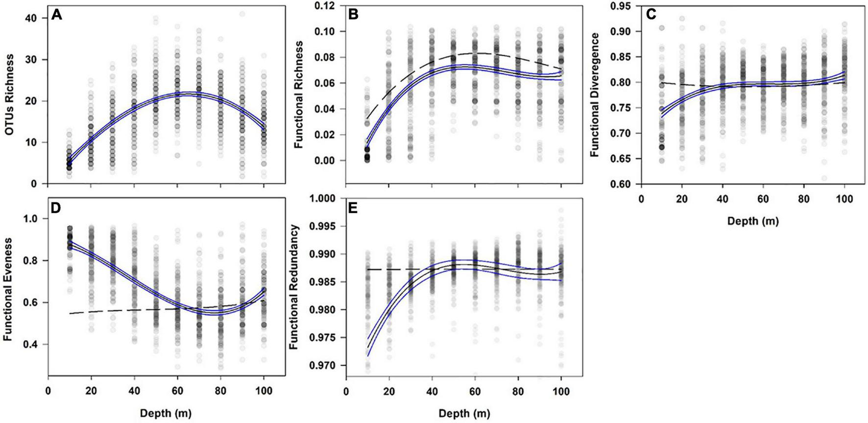 Relationship of Operational Taxonomic Units (OTUs) diversity and Functional Diversity across 10–100°m depth. Line (model) of best first is non-linear regression (cubic model, black line). Points are samples with increasing shades of grey representing a greater number of samples. Blue lines are 95% confidence intervals. Black dotted line are null functional diversity estimates. Total sample number minimum 1484 per panel. (A) – OTUs Richness, (B) – Functional Richness, (C) – Functional Divergence, (D) – Functional Evenness and (E) – Functional Redundancy.