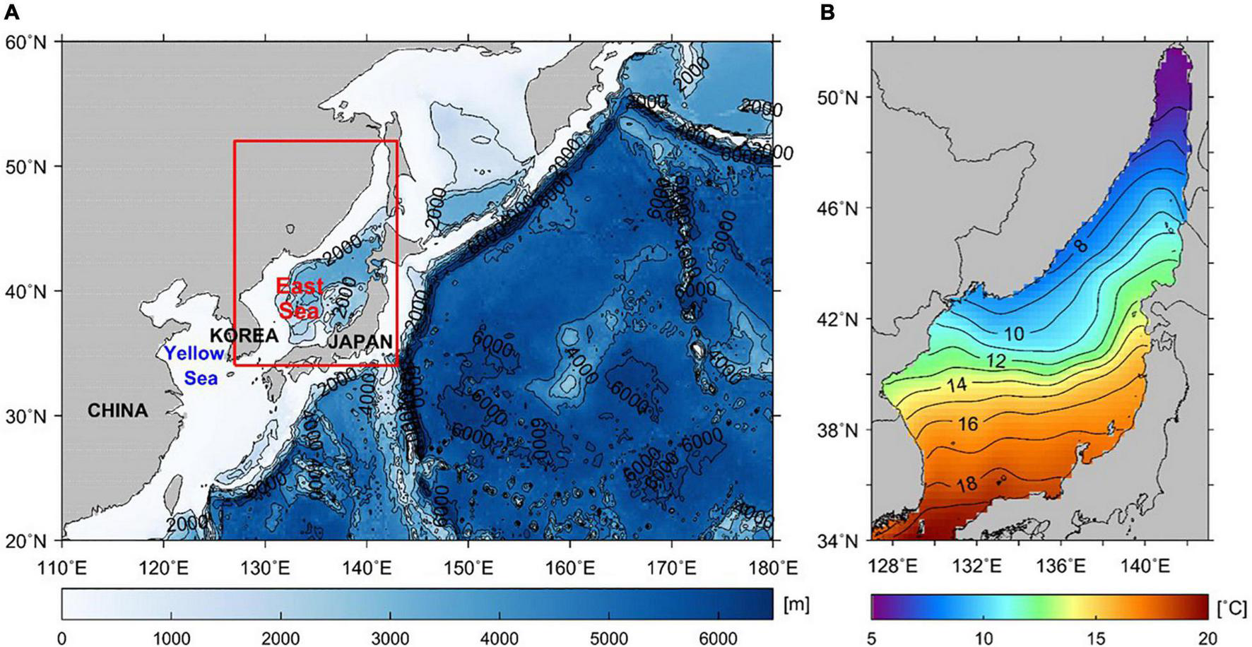 (A) Bathymetry of the Northwestern Pacific, where the red box shows the study area of the East/Japan Sea (EJS), and (B) the spatial distribution of long-term averaged satellite-derived sea surface temperatures (SSTs) for the period from 1982 to 2018.