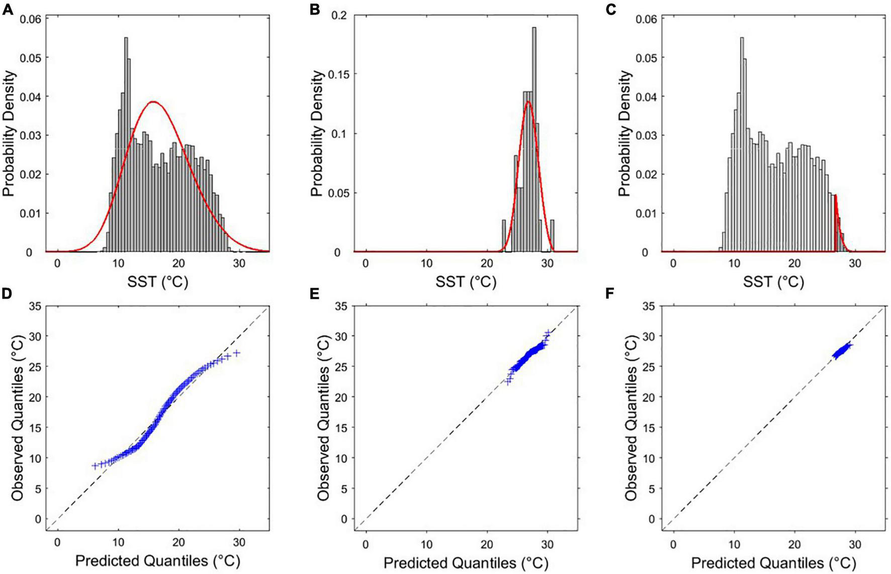 Examples of the distribution of probability of SST values, where the red line represents the fitted distribution for the computation of the extreme SST by (A) initial distribution method (IDM), (B) block maxima method (BMM), and (C) peaks-over-threshold (POT) method, respectively. (D–F) The comparison results between the predicted and observed quantiles from panels (A–C).