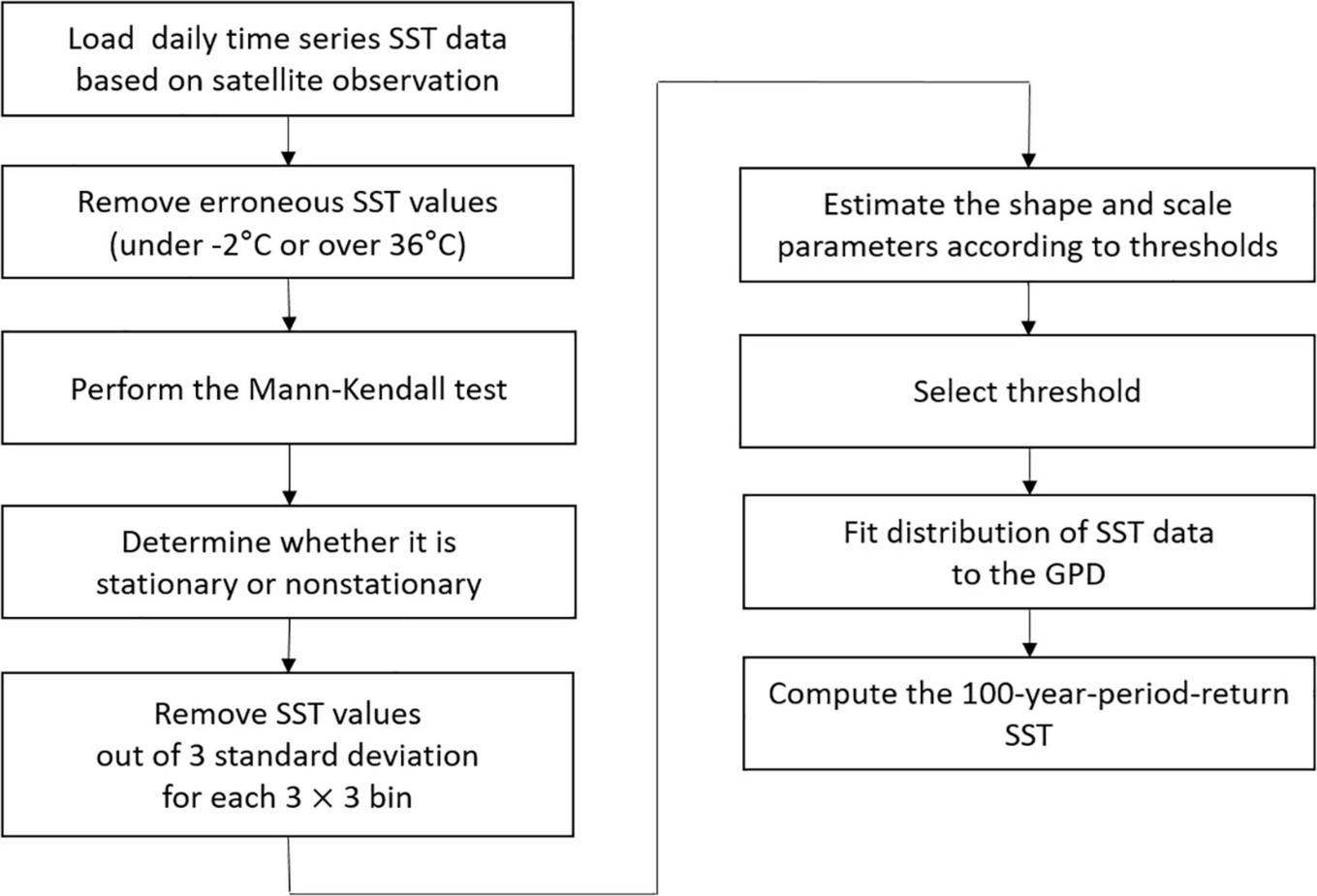 Flow chart for the computation of extreme SST using the POT method based on generalized Pareto distribution (GPD).