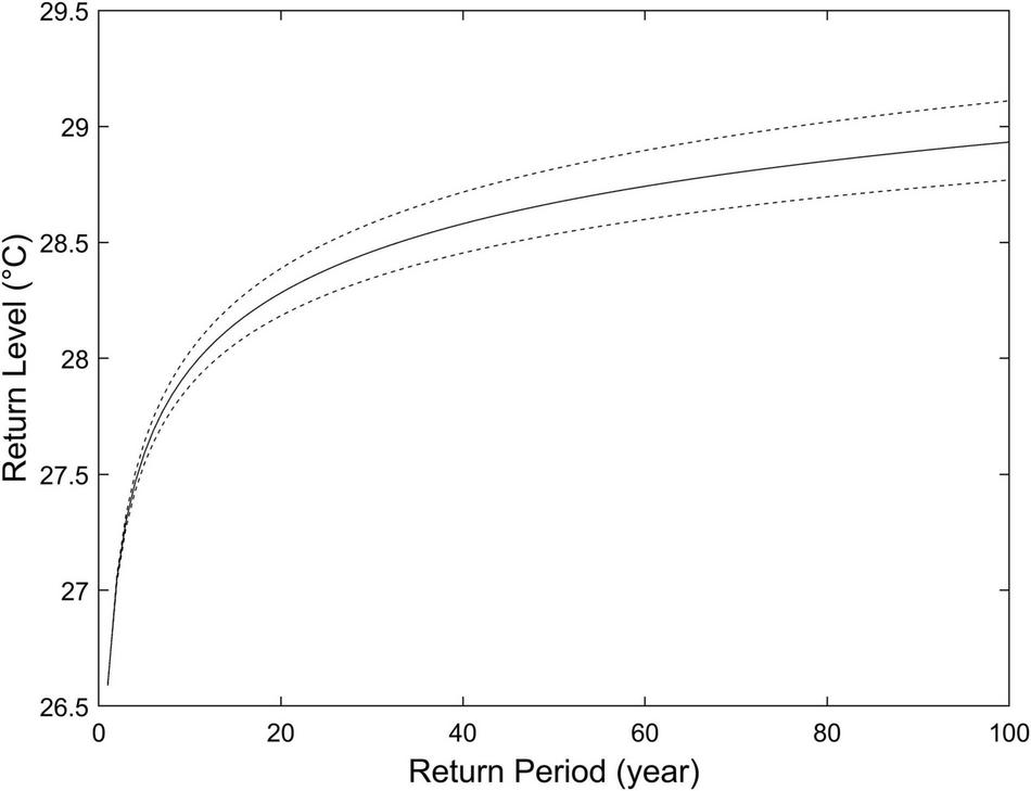The confidence intervals were calculated with the computed extreme SSTs. According to Coles (2001), the variance of the long-period return value is calculated using the variance-covariance matrix and the delta method as follows: