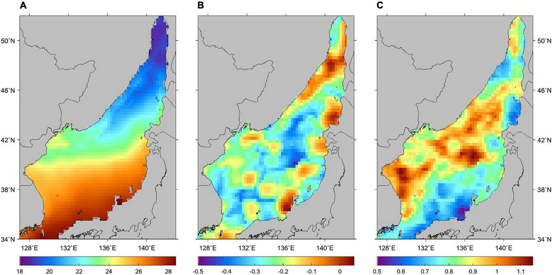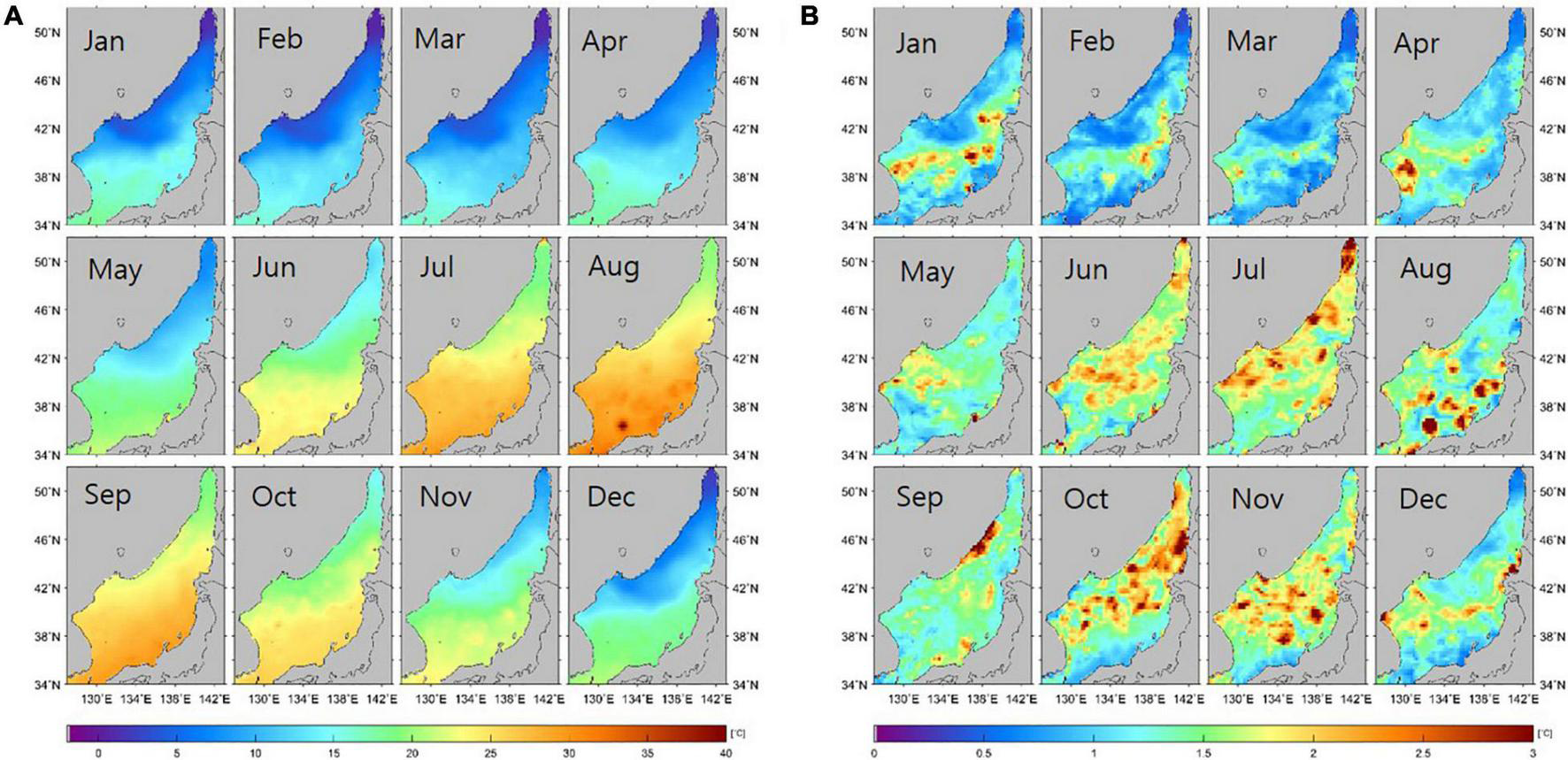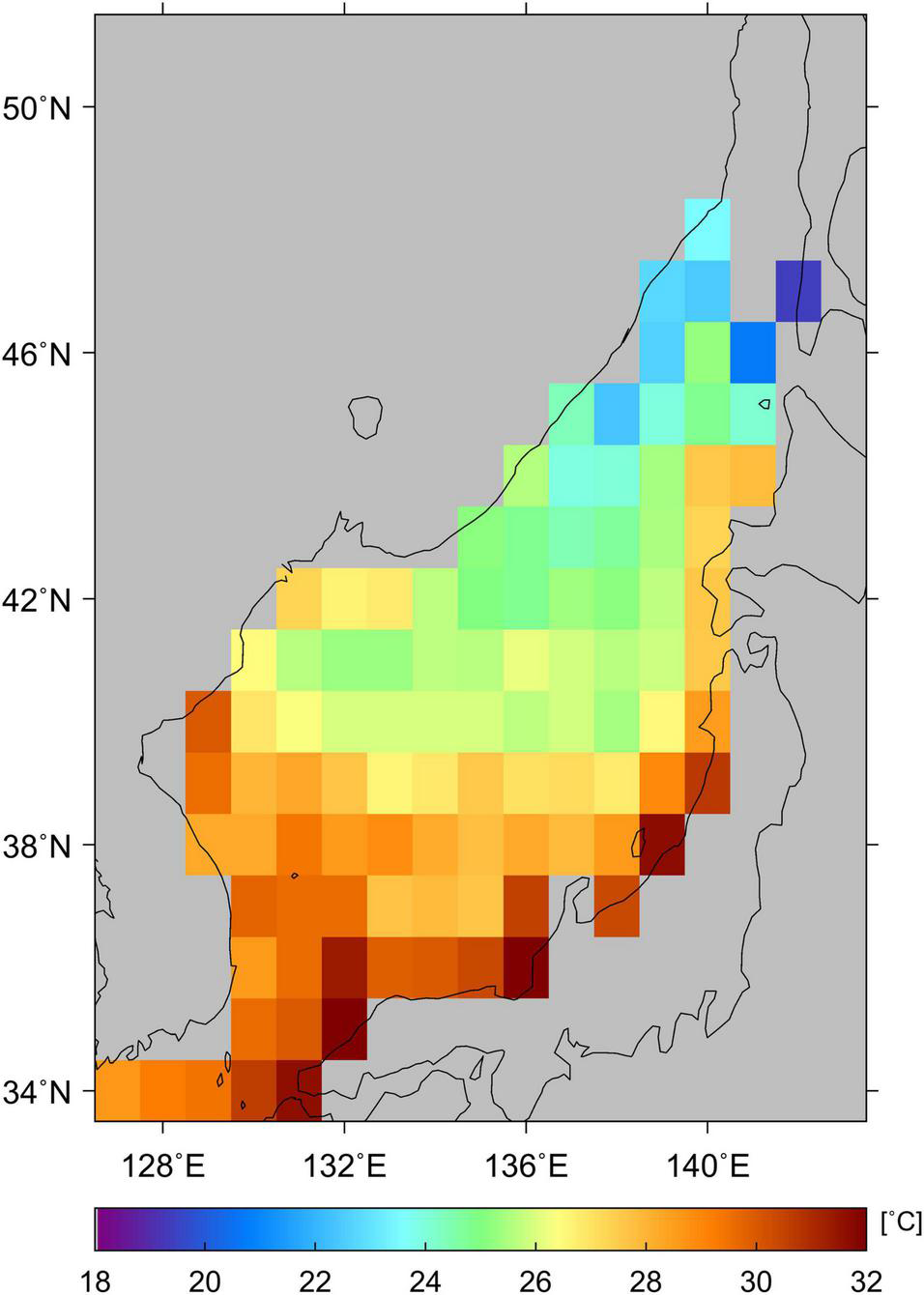 The Optimum Interpolation Sea Surface Temperature (OISST) data is one of the most representative SST databases based on Advanced Very High Resolution Radiometer (AVHRR) data with the longest time period from September 1981 to the present. This database was produced by combining observation data from different instruments, including satellites, ships, buoys, and Argo floats. In the process of producing data, objective interpolation was conducted to fill the gaps, and bias adjustment was applied to the observation data to compensate for differences in different observation equipment and sensors (Reynolds and Smith, 1995; Reynolds et al., 2002, 2007; Banzon et al., 2016). The OISST database is a daily product with a spatial resolution of 0.25°. In this study, the OISST version 2 data for the period of from 1982 to 2018 were obtained from the National Oceanic and Atmospheric Administration (NOAA)/Oceanic and Atmospheric Research (OAR)/Earth System Research Laboratory (ESRL) Physical Sciences Lab (PSL)1 and used to compute the extreme SST value in the EJS.