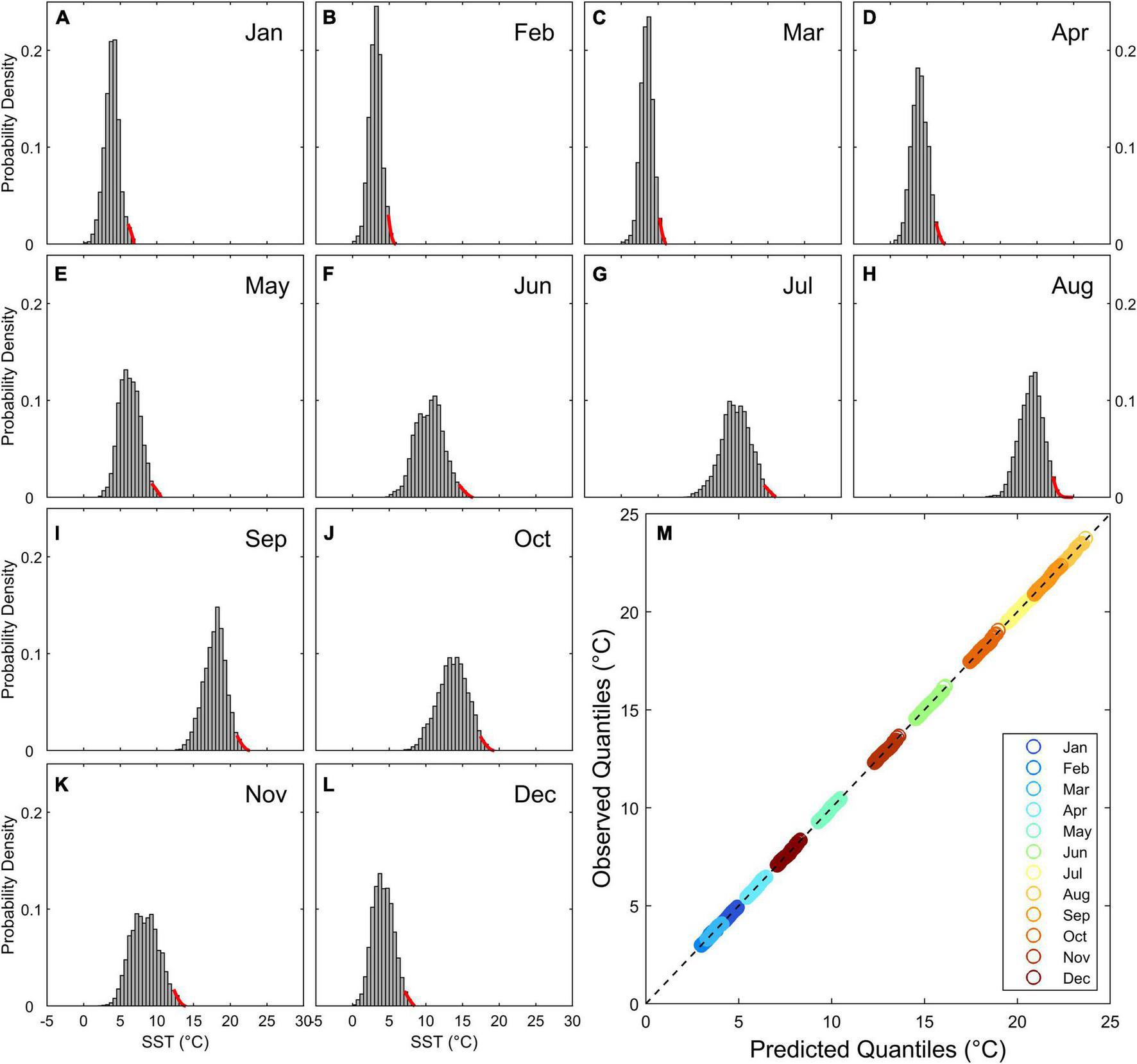 Examples for the computed result of the monthly extreme SST. (A–L) Distribution of the probability of monthly SST values, where the red line represents the fitted distribution for the computation of the extreme SST by the POT method and (M) Q-Q plot for all months.