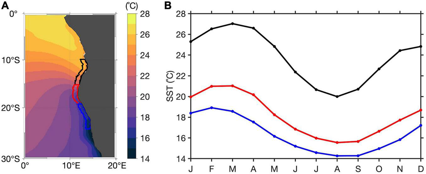 (A) Annual climatology of SST with geographical delimitations of the coastal zones of interest overlaid: Southern Angola (10–15°S, 1°-width coastal fringe) in black, Angola Benguela front (15–19°S, 1°-width coastal fringe) in red and Northern Namibia (19–24°S, 1°-width coastal fringe) in blue. (B) SST climatology in the three coastal zones of interest shown in panel (A). The climatology is calculated relative to the period January 1982 and April 2020.